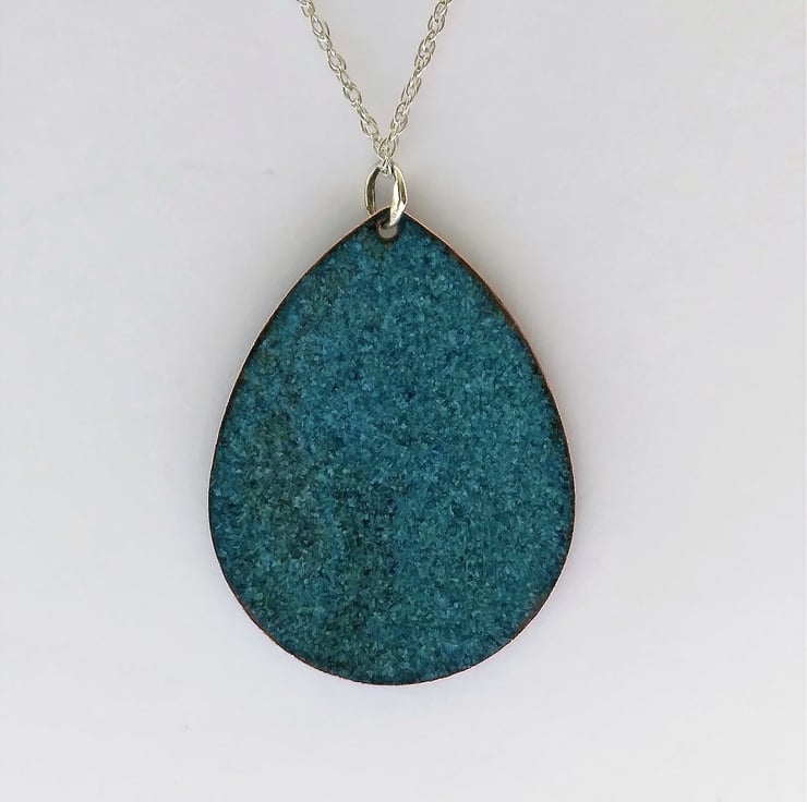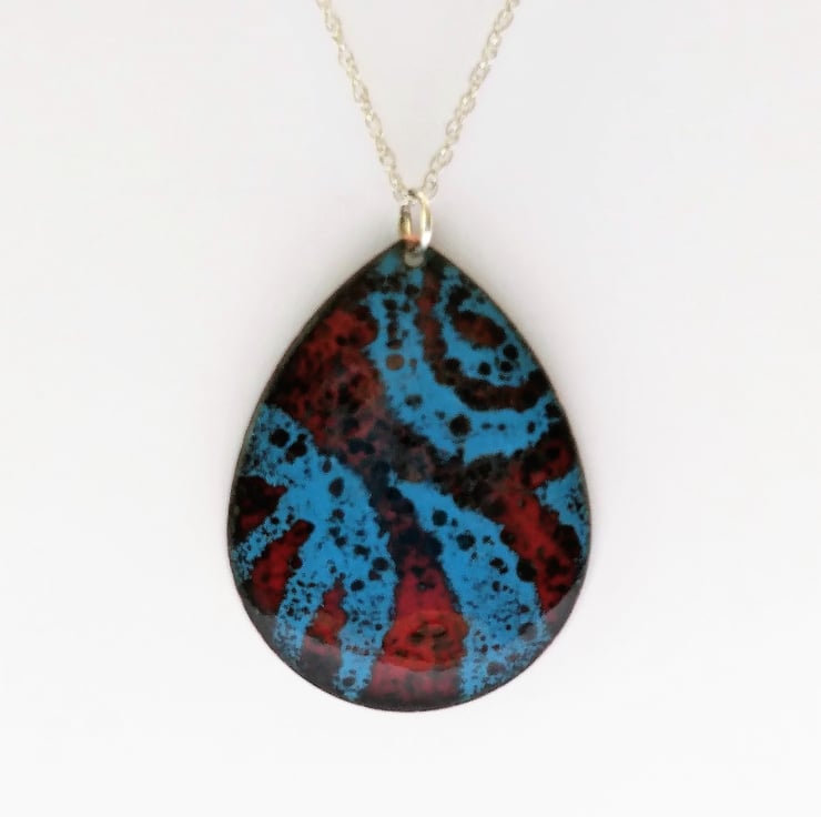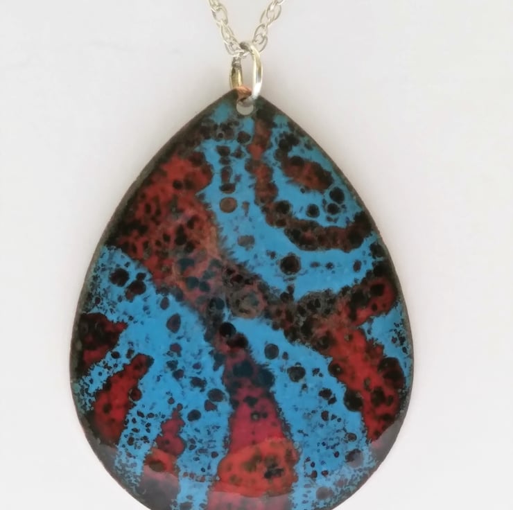 Large, domed teardrop enamelled copper pendant in dark red and teal enamel. The pendant has been kiln-fired and measures approximately 42mm tall and 33mm wide. The back has been counter enamelled in tweedy green to give a comfortable feel against the skin. It comes complete with an 18” sterling silver rope chain with a soldered sterling silver jump ring and is supplied with a little organza pouch. POSTAGE IS FREE!
