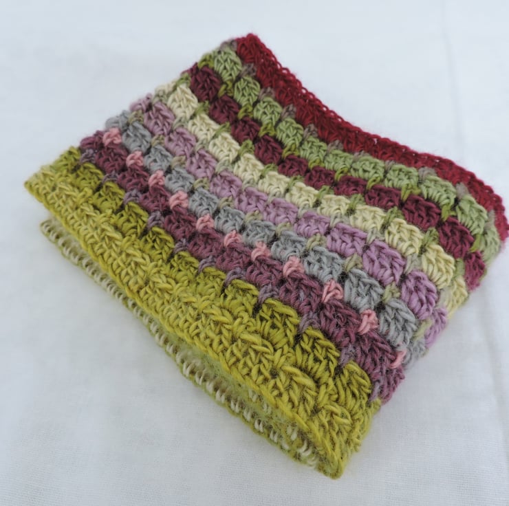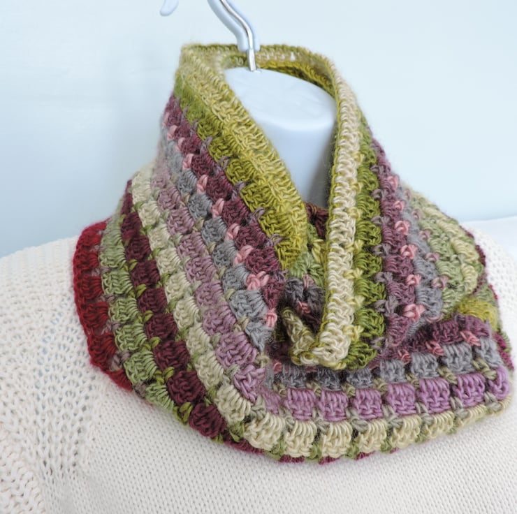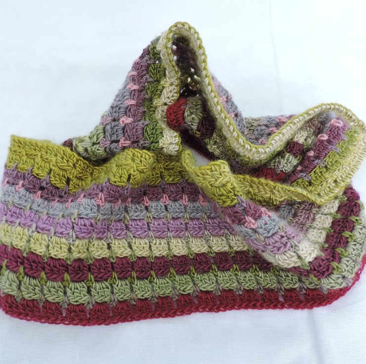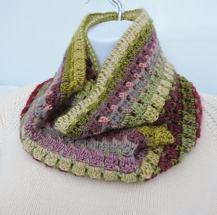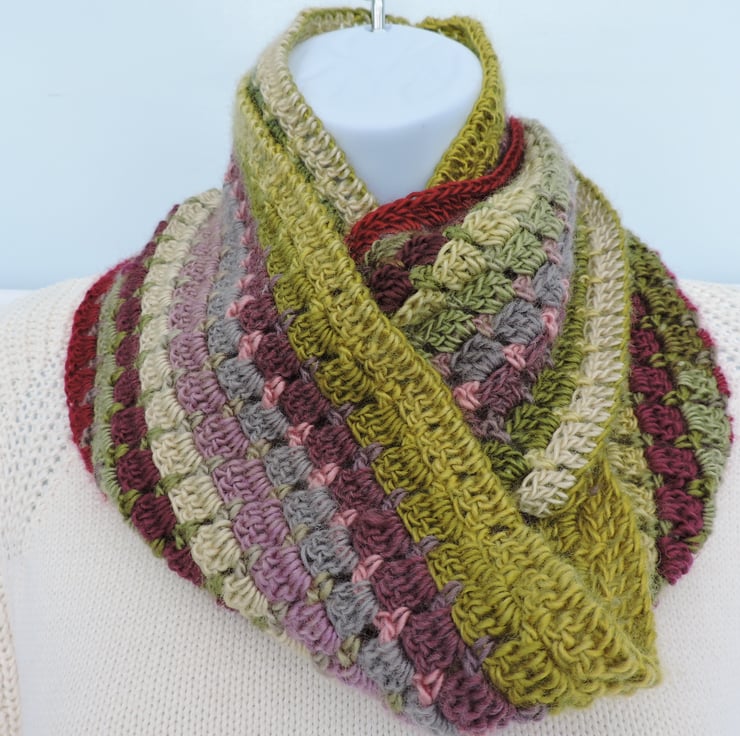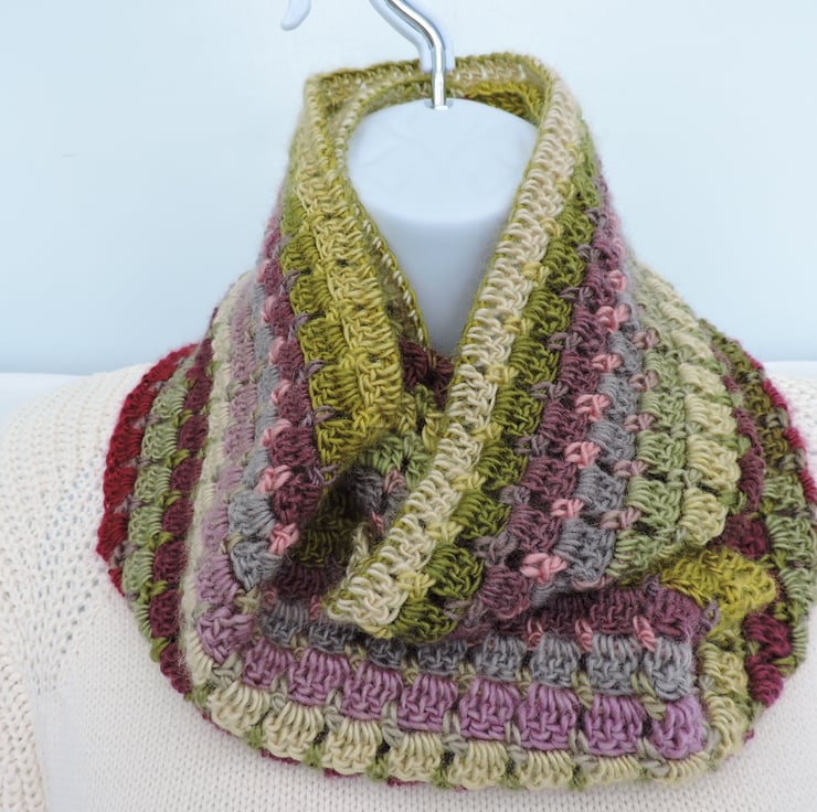 I've made this crochet infinity scarf, cowl with double knit wool and acrylic yarn. Graduated colours of olive, lime, magenta, grey, pale green and pink. A soft and cosy winter warmer, wear it long or wrapped twice around your neck to make a cowl to keep you snug and warm. .