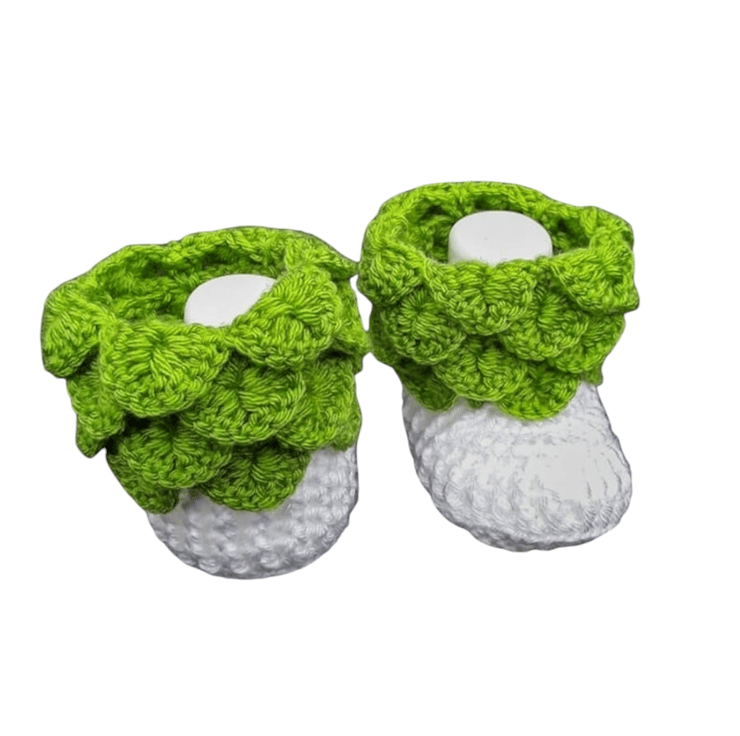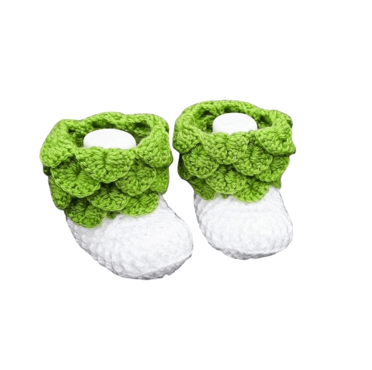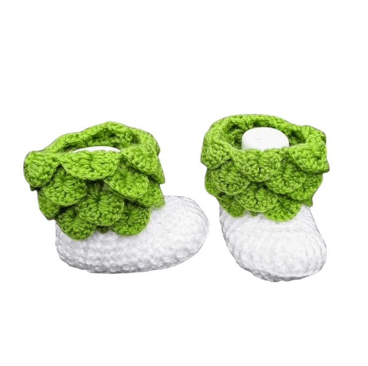 Elevate your baby's attire with these adorable crocodile stitch baby booties in green and white, a fun and stylish addition to any baby's wardrobe.