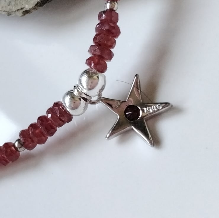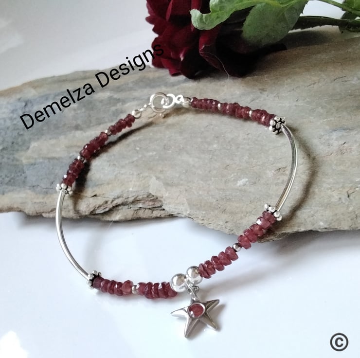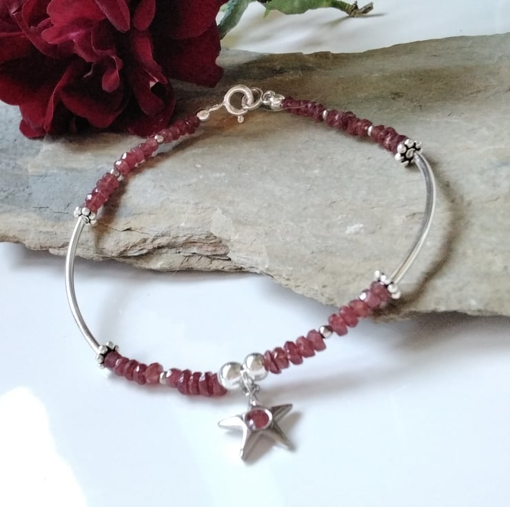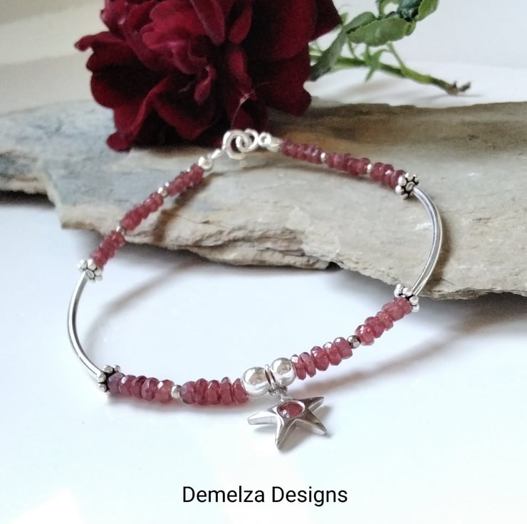 A very pretty eye catching dainty feminine bracelet designed and hand crafted in Cornwall by Demelza Designs. The total weight of 14.65cts of quality genuine untreated faceted deep ruby red rondelle cut gemstone beads which slightly graduate in size have been used. In the centre is a dainty sterling silver star charm with a genuine 0.84ct African faceted gem grade ruby in the centre. All other outer components are 925 sterling silver.