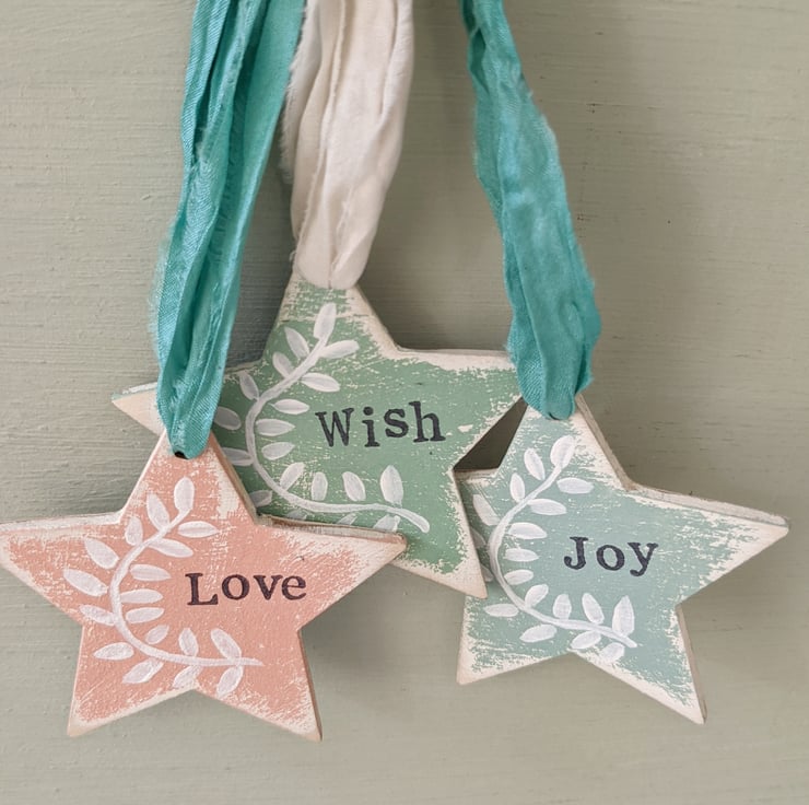 These little birchwood stars are all individually hand painted, and stamped with words of positivity!