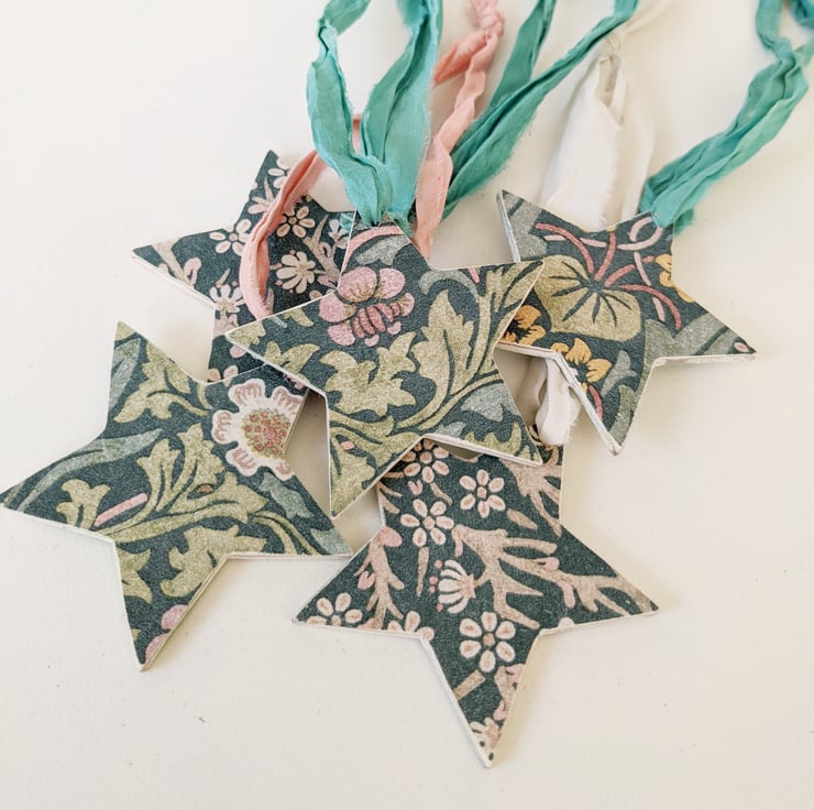 Hand painted with pretty leaf motif and stamped words this one of a kind star hangs with recycled silk sari ribbon.