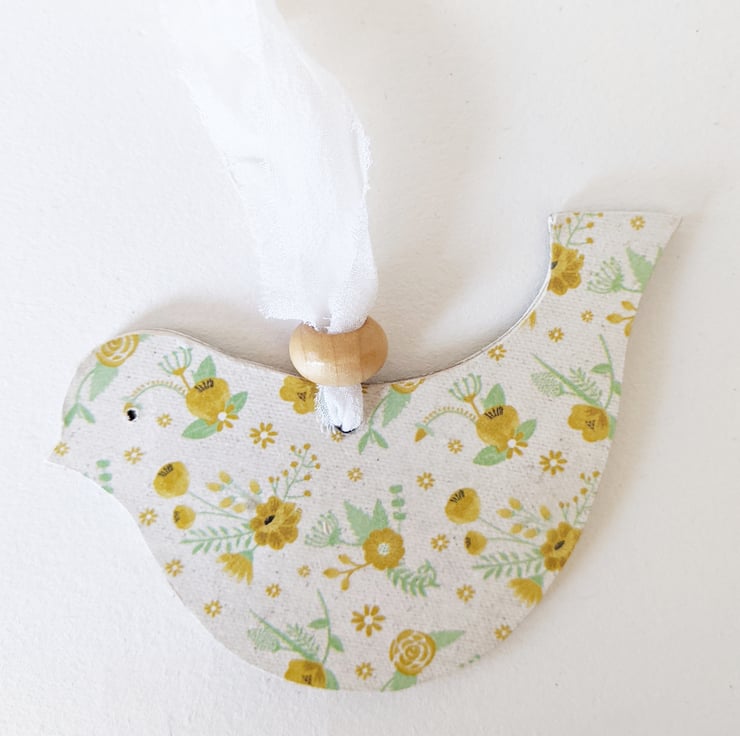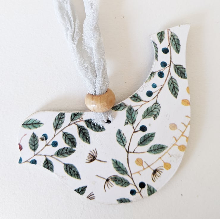 Hand painted with pretty leaf motif and stamped words this one of a kind bird hangs with silk ribbon and a wooden bead.