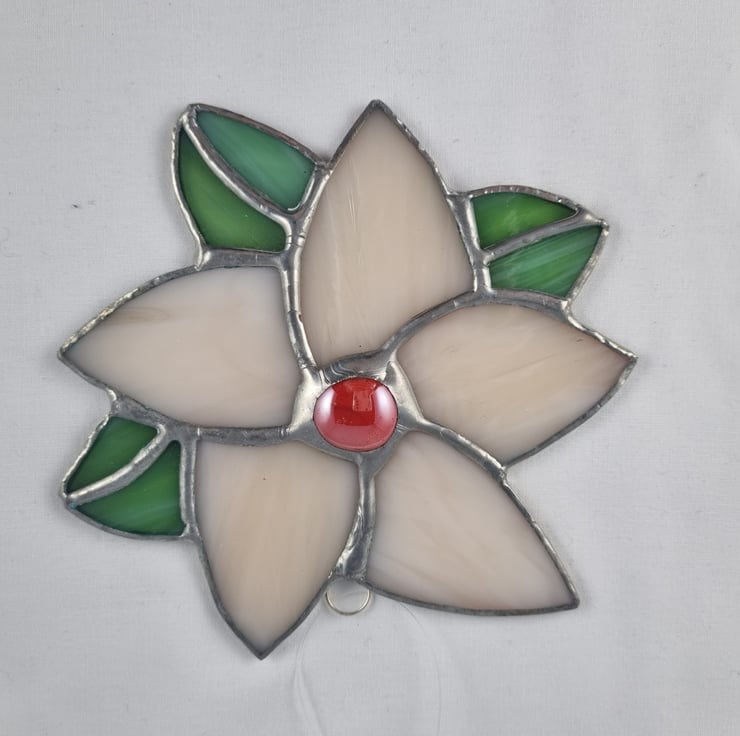 This clematis flower is made using cream, pink and green glass and has a ring with invisible thread for hanging.