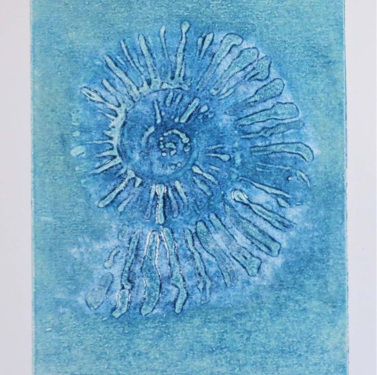 Original collagraph print of a jurassic ammonite spiral fossil printed in aqua and turquoise ink on white paper. This is no.3 print in a variable edition of 5 (no two prints in the edition will be the same). Image size 16x22.5( approx6.25x9inch) and comes unmounted on paper measuring 20.5x29cm ( 8x11.5inch approx).