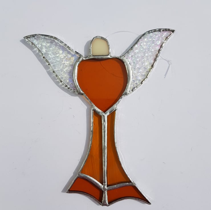 This large heart angel is made using gold, cream and clear, textured glass with a ring and invisible thread for hanging.