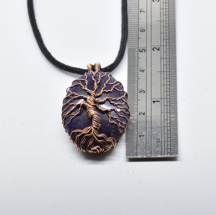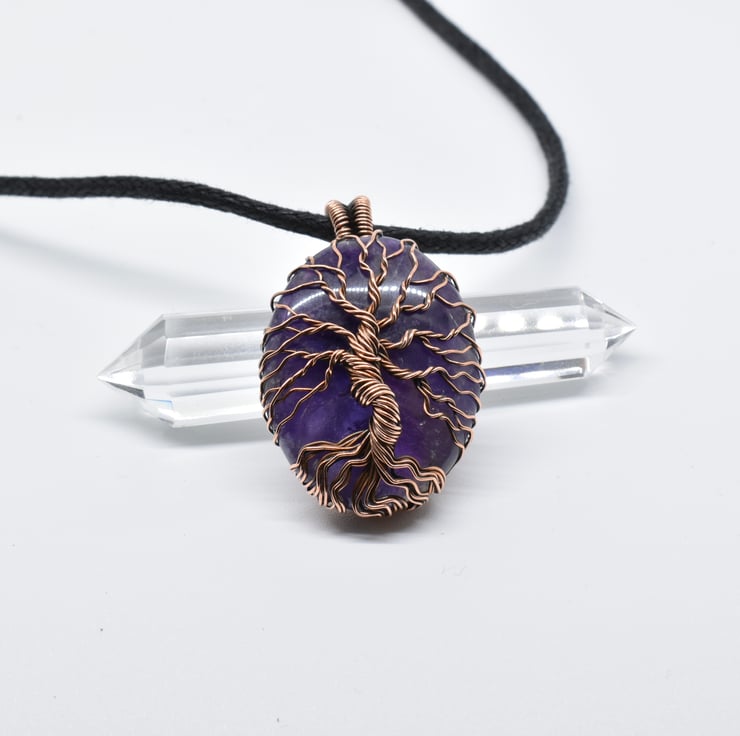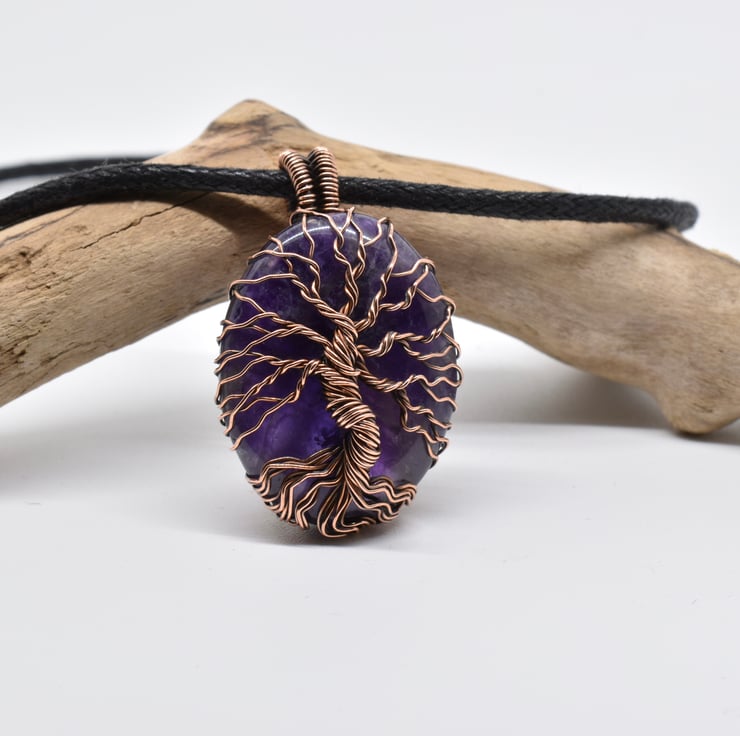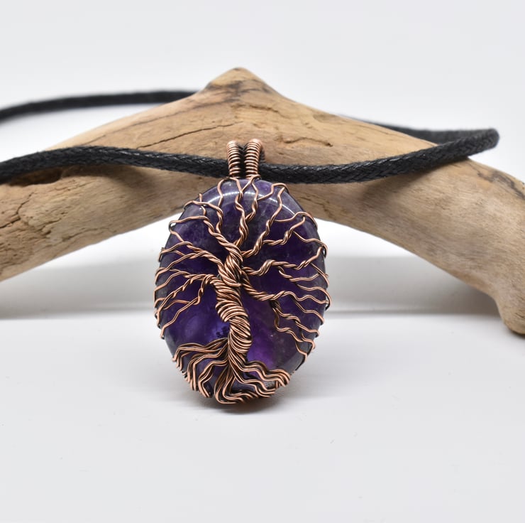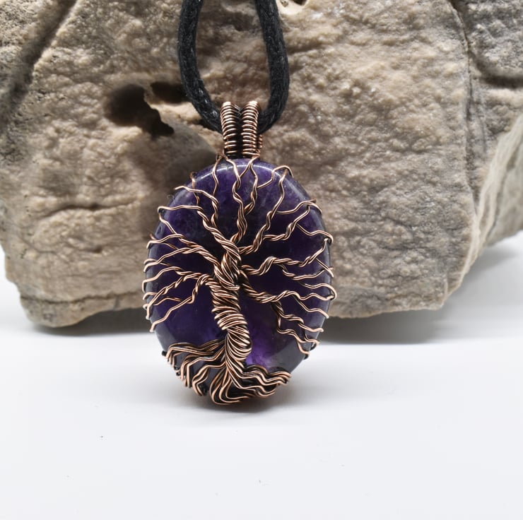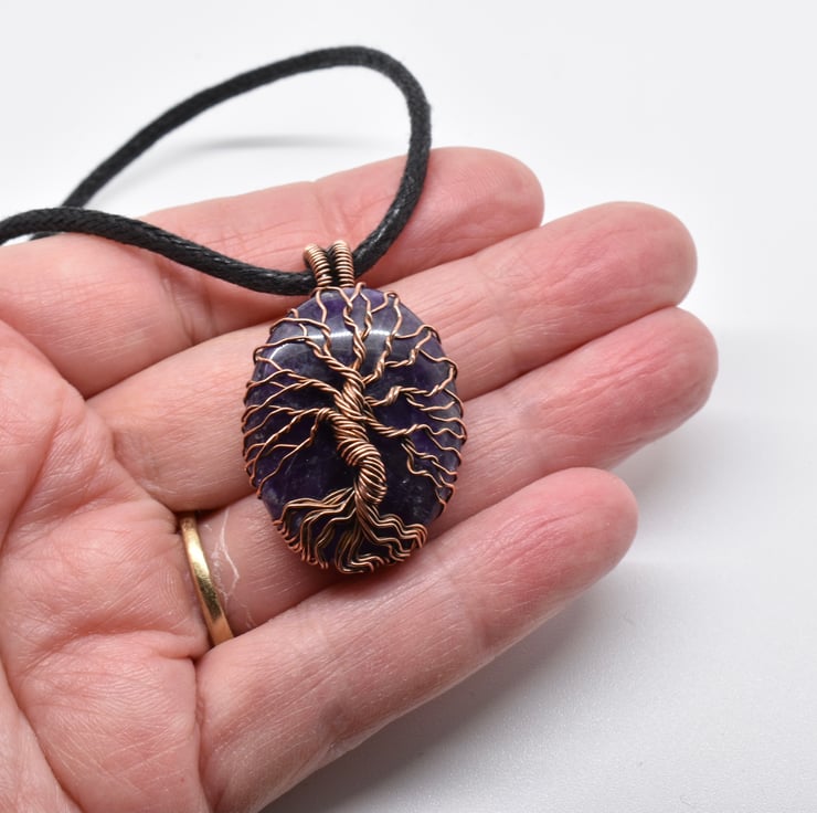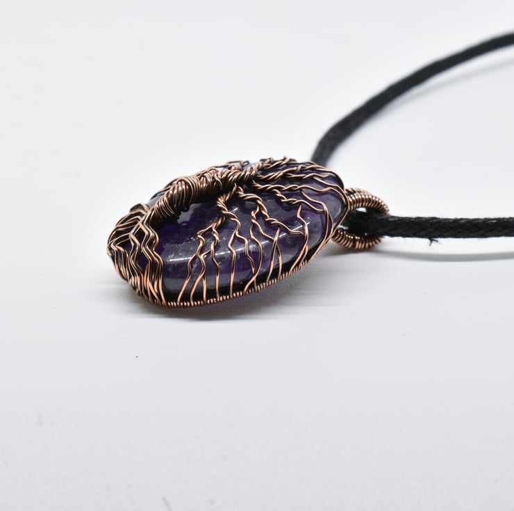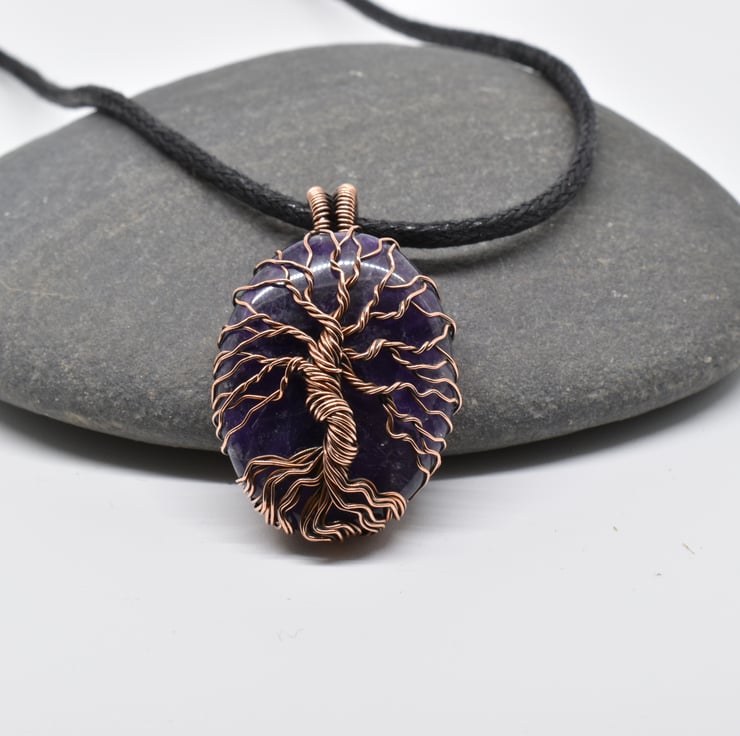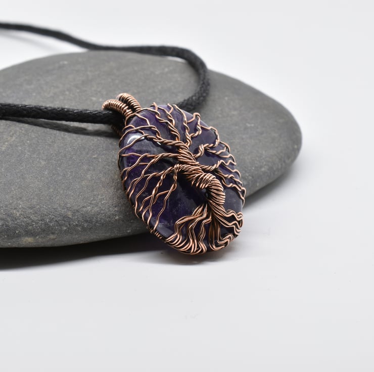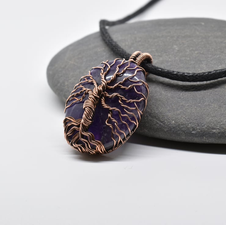 I wire wrapped the tree design to the face of this pretty amethyst using solid copper wire then added a woven bail to complete this unisex pendant.