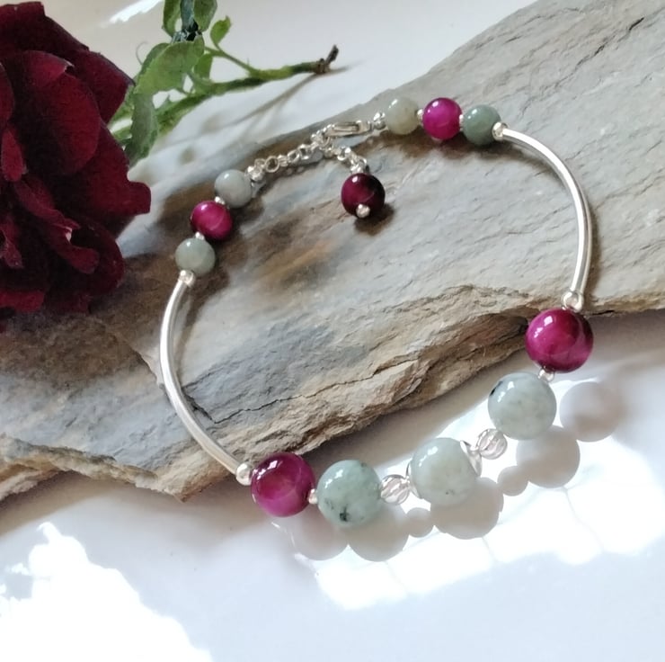 A stunning bracelet designed and hand crafted using 20.40 cts of genuine Burmees Jadeite complimented with 13.50 cts of pink tiger's eye. All other outer components are made from 925 silver.