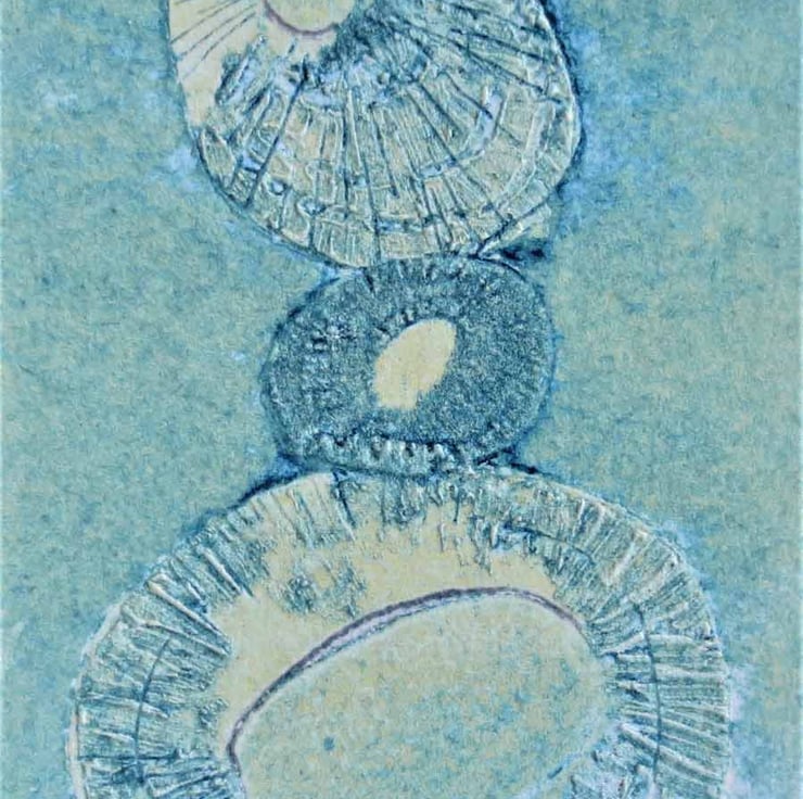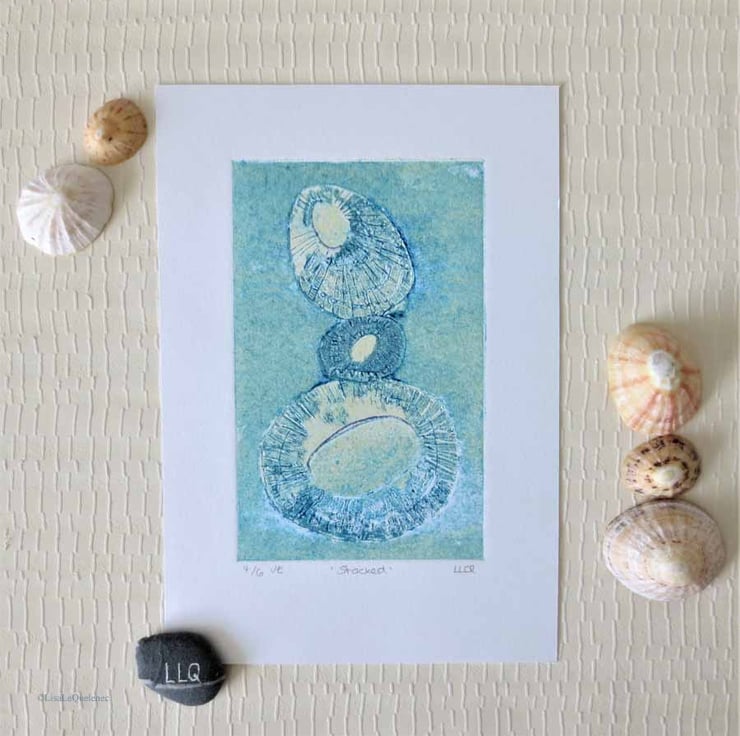 Inspired by limpet shells collected at the beach. An original drypoint collagraph print no.5 of a varied edition of 6 (no two prints look the same). Measuring 8x13cm (3.25x5.25inch) approx. on paper measuring 14x20cm (5.5x8inch) approx. and comes unmounted.