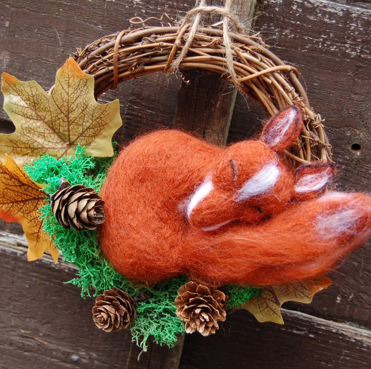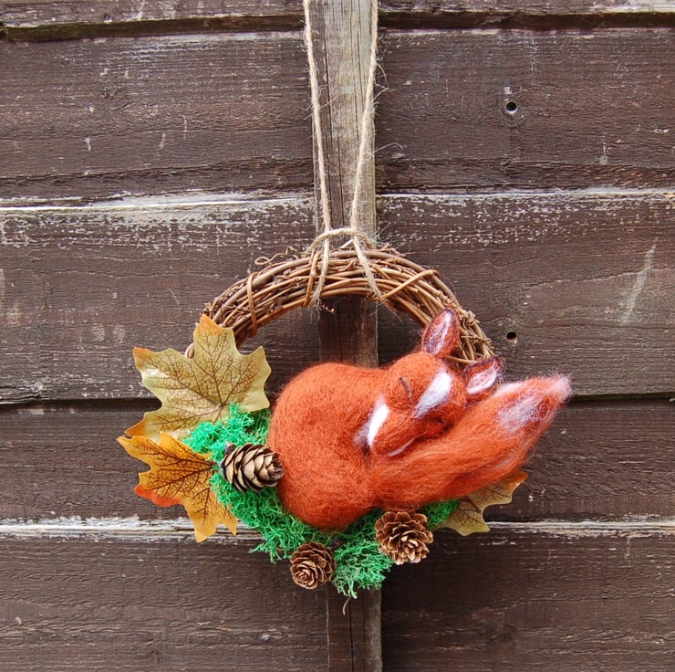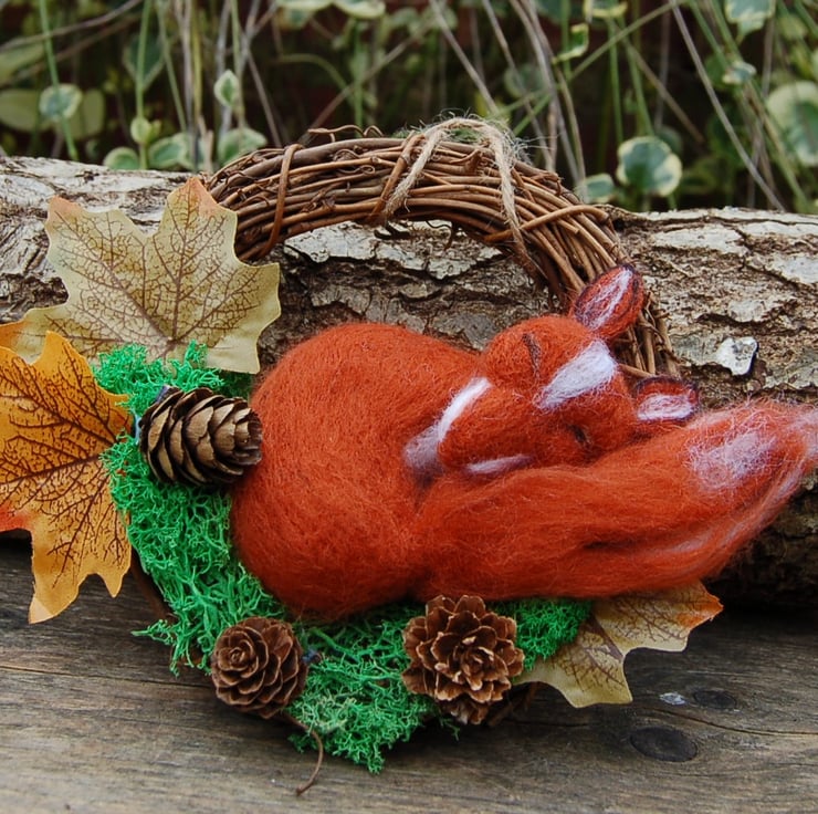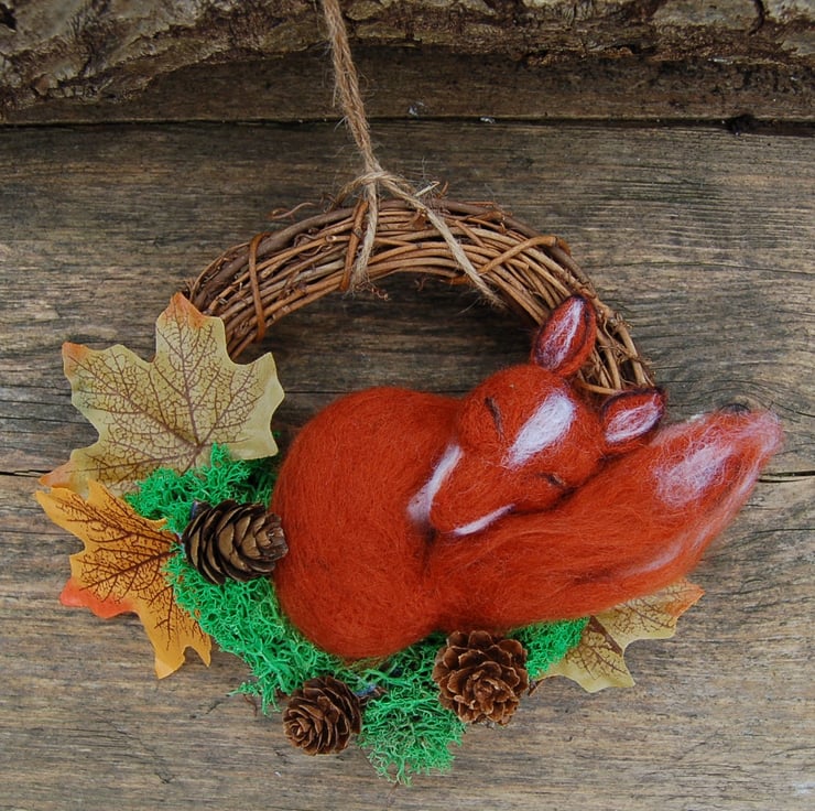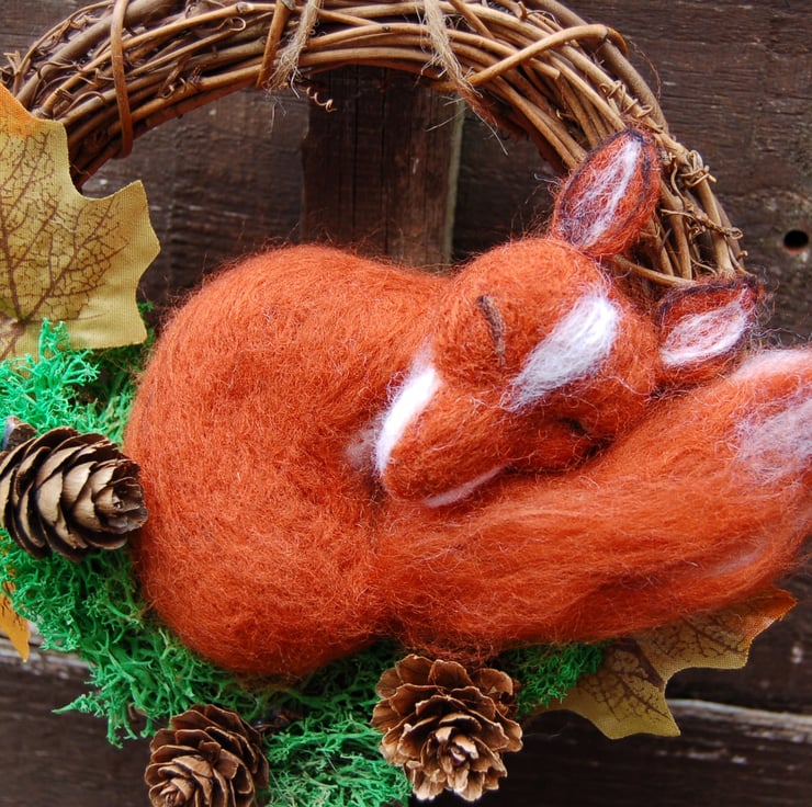 I've used wool fibres to needle felt a lovely fox asleep with its head on its tail. Attached to a vine stem wreath, with fabric flowers, reindeer moss and pine cones. I've attached a length of hem twine as a hanger but the wreath can be also be displayed laid flat