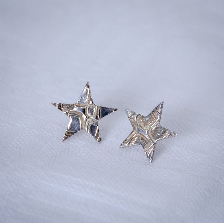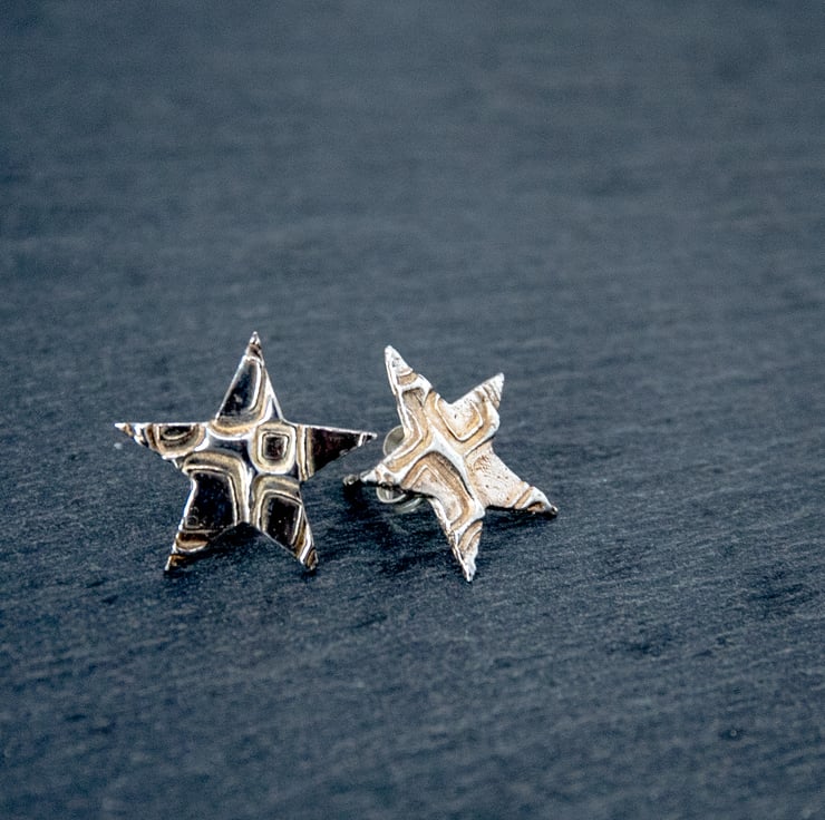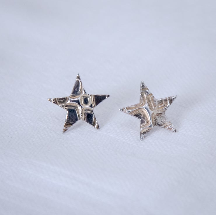 These are patterned star stud earrings, they are made from silver clay with a geometric pattern a applied.