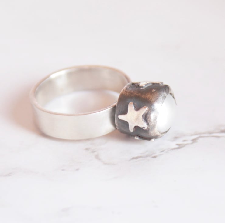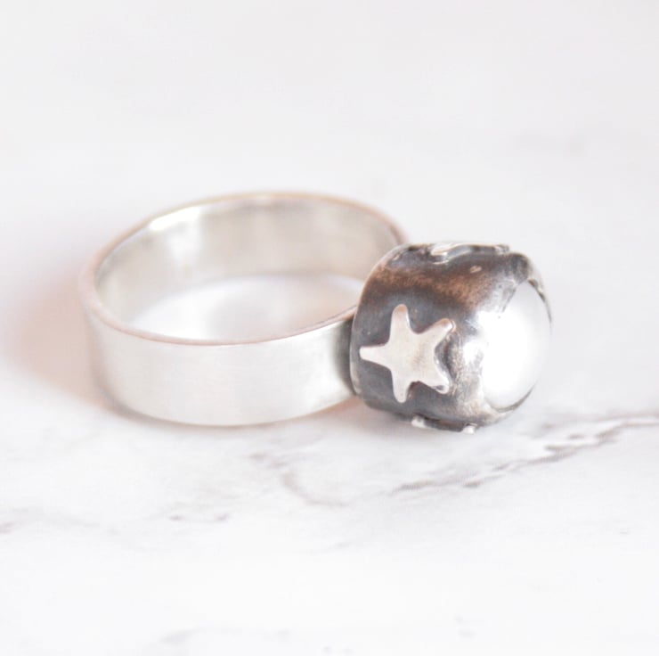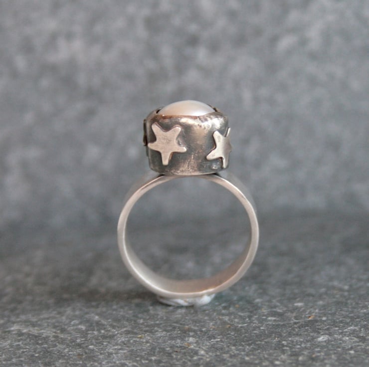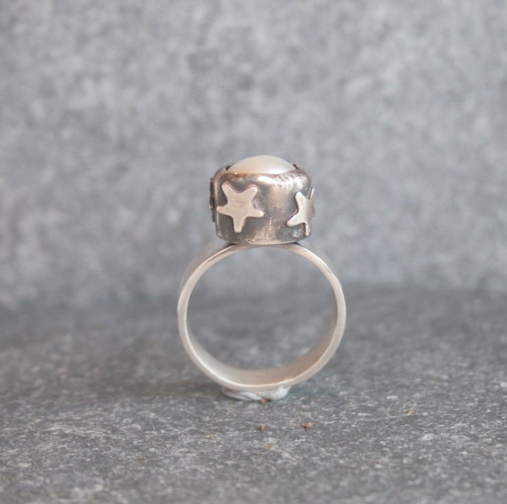 I have set an ivory freshwater pearl in a handmade high sided sterling silver bezel onto which I have soldered four little stars. This is attached to a wide sterling silver band with a width of 5mm.