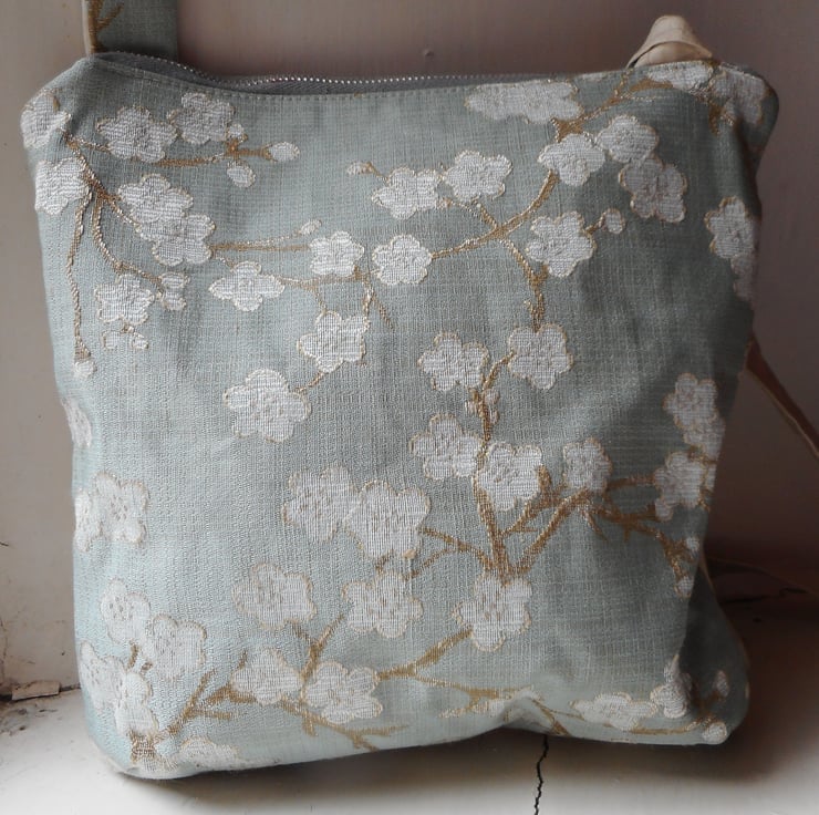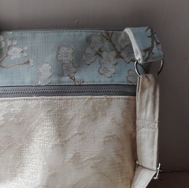 Cream jacquard fabric is used for the lower front, whilst a soft duck egg and cream cherry blossom woven jacquard is used for the top front and back sections. The strap is created from a cream cotton.