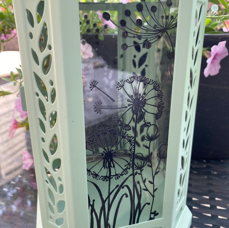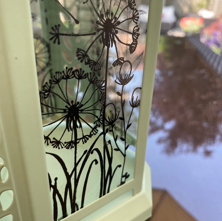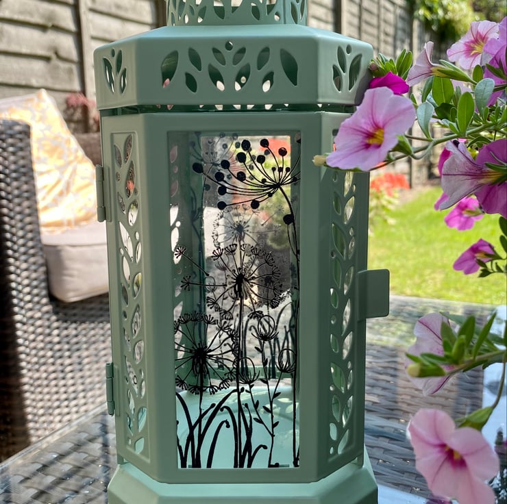 The four glass panels of the lantern have been screen printed with black enamel in a beautiful floral design with flowers, stems, leaves and dandelion heads.