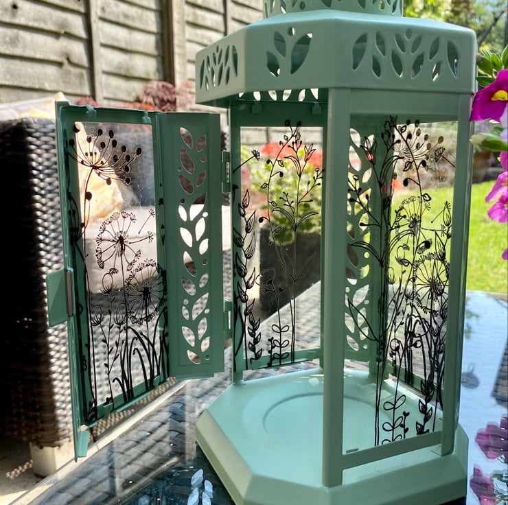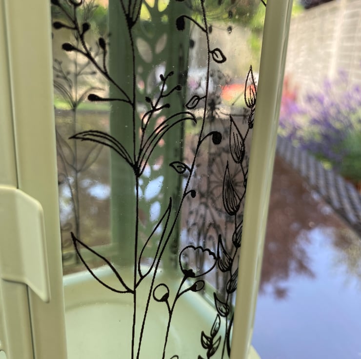 The plain glass of this lantern has been transformed using a gorgeous enamelled design