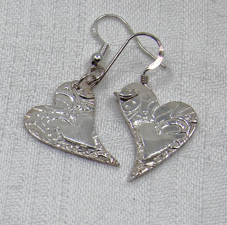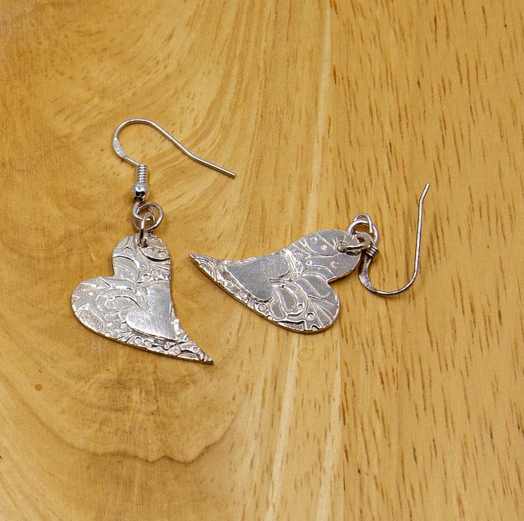 These dangling earings have a double heart, the larger has a floral pattern on it whilst the smaller is unpatterned.