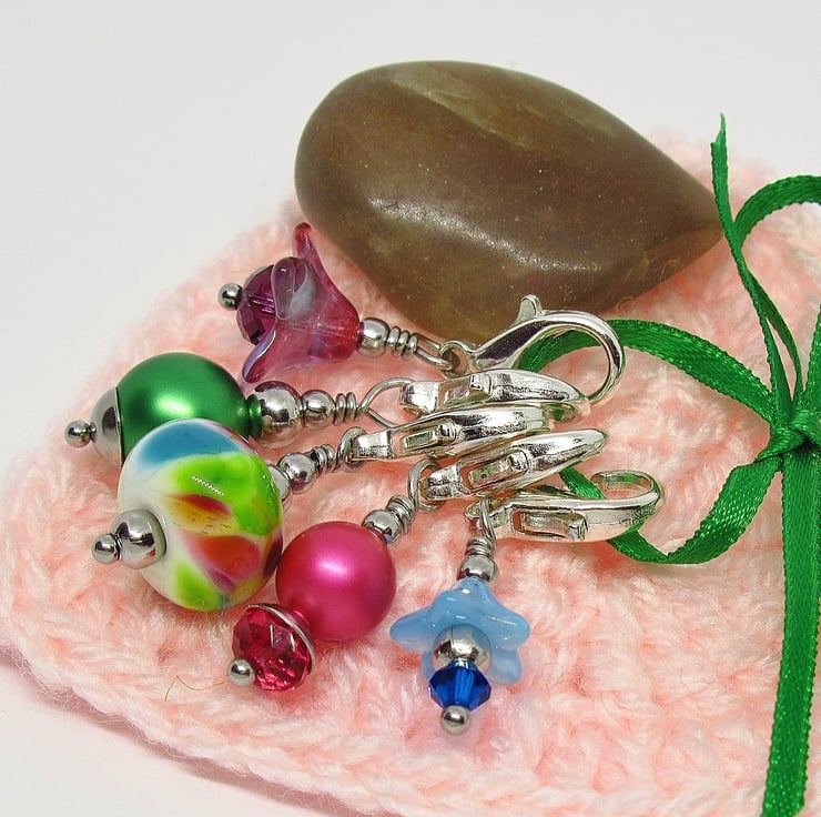 Set of 5 handmade stitch markers in co-ordinating floral shades, perfect for keeping track of stitches in your crochet or knitting projects.