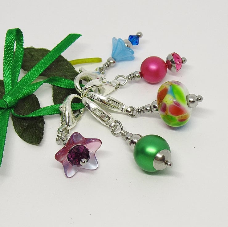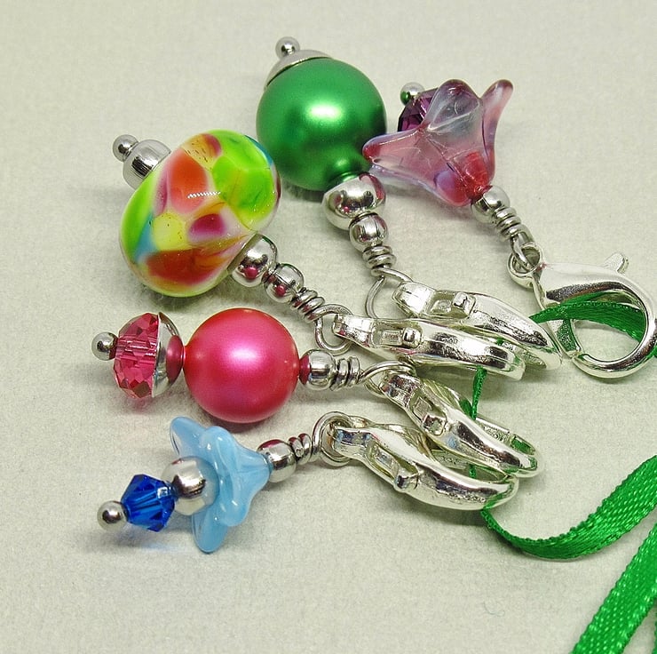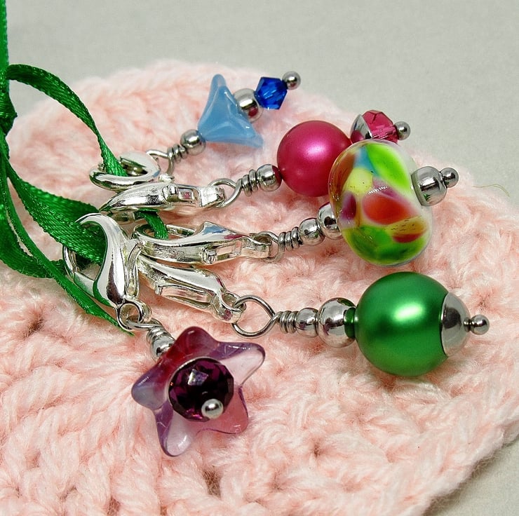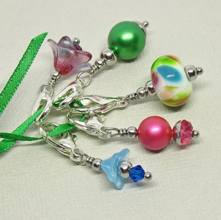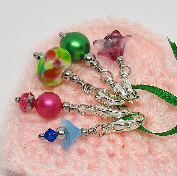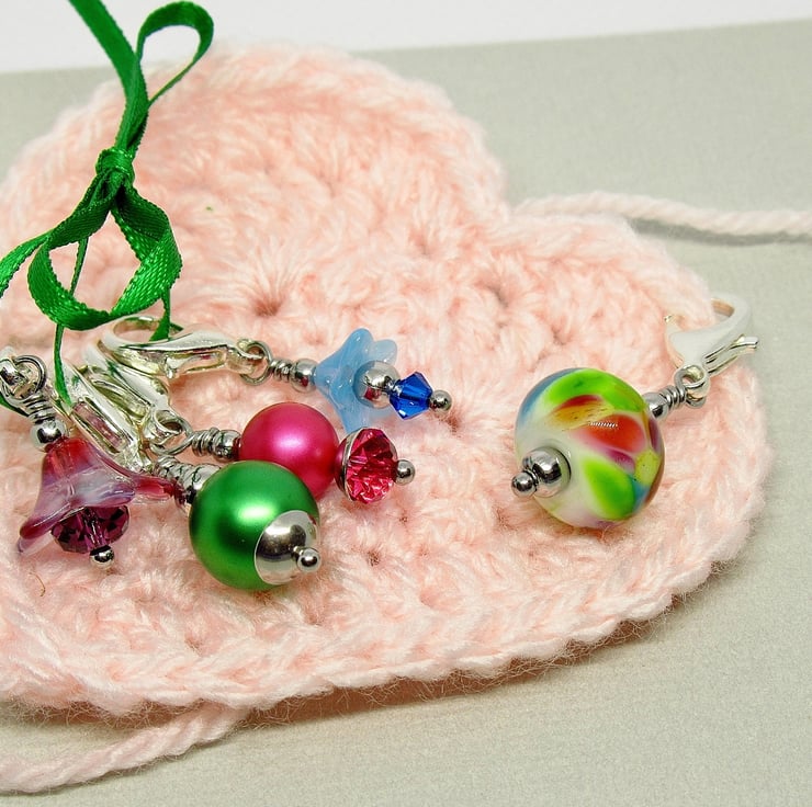 These pretty stitch markers are made using artisan lampwork glass beads, Swarovski pearls and crystals.