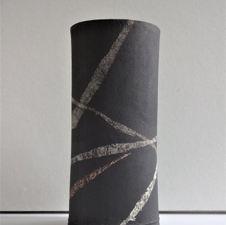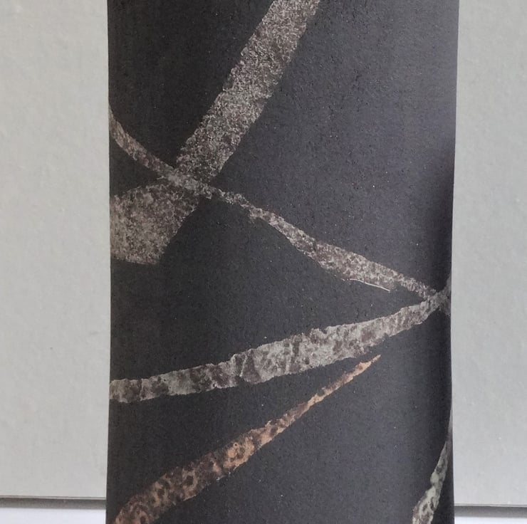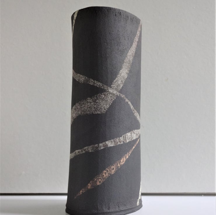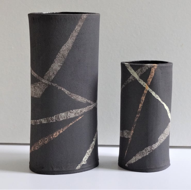 This soft oval shaped vase is perfect for garden flowers, fresh or dried, or for a display of ferns or evergreens. I’ve chosen some astrantia and scabious flowers from my garden to show how the vase works well with informal arrangements to give a fresh modern look to your room. I work by hand with black stoneware clay, then decorate the surface with freeform streams of ribbon-like lines in grey, lemon and orange yellow which swoop around the piece. Inside I used an iron lustre glaze with tones of rust and blue, while the outside is left unglazed black clay. Each of my vases is different in looks and character, so each has a name, and this one is Sian – 15 cms high and 7cms at the widest part of the oval base, which bears my potters’ mark of a swallow. One of the images shows Sian with a smaller but similar vase.