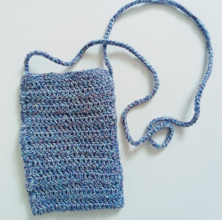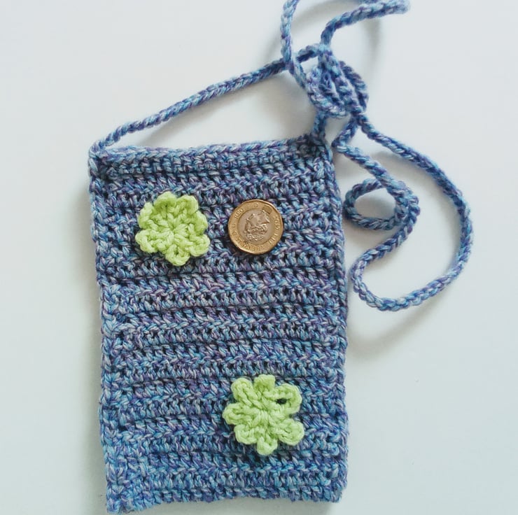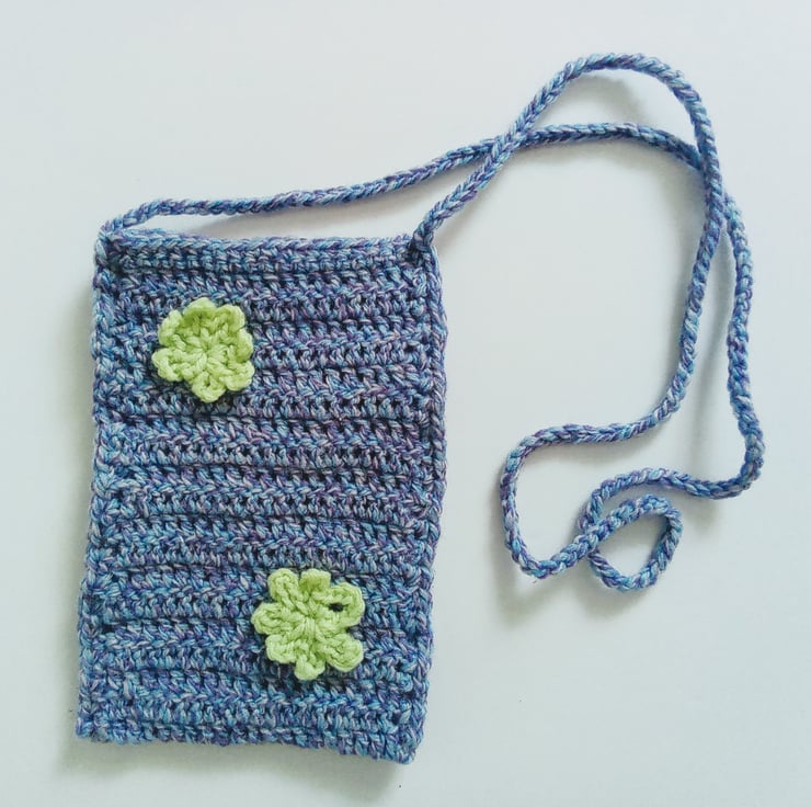 A crocheted bag decorated with two handmade crocheted flowers ideal for a young girl.