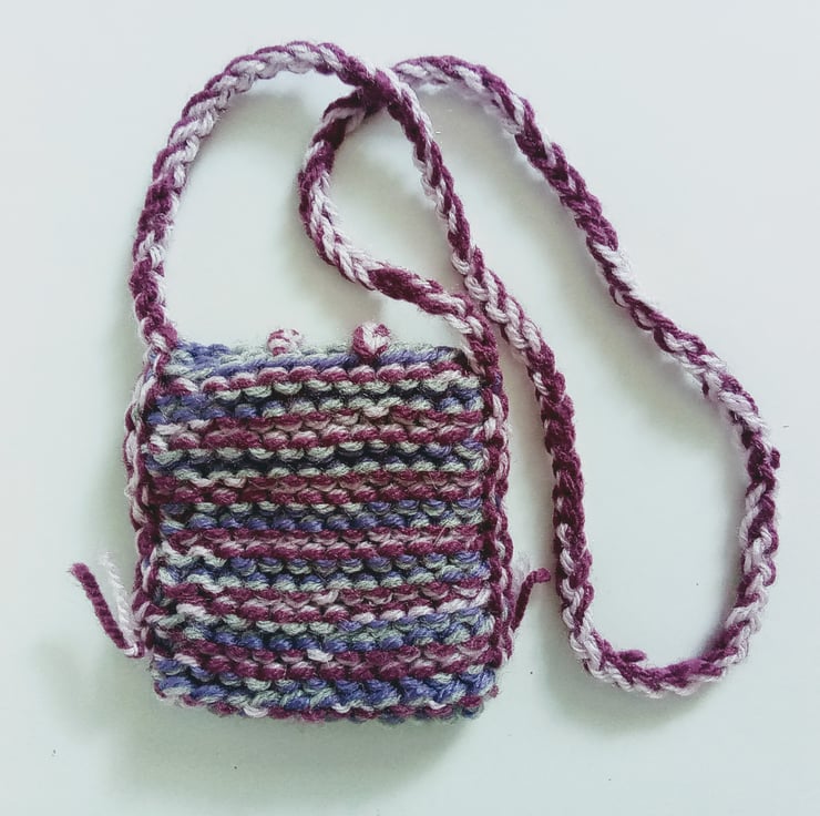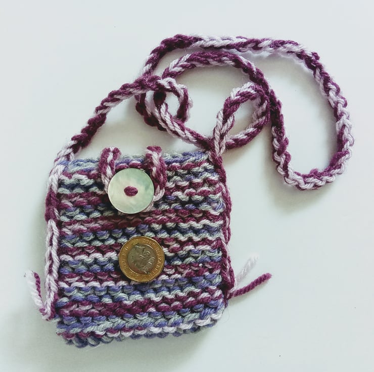 A knitted bag ideal for a young girl which can also be used as a neck purse for an adult.