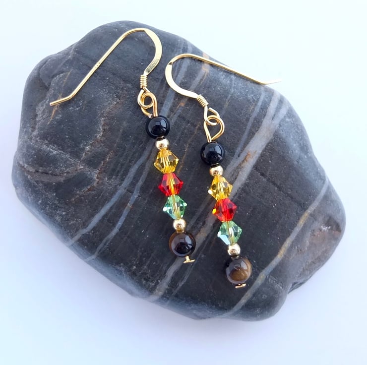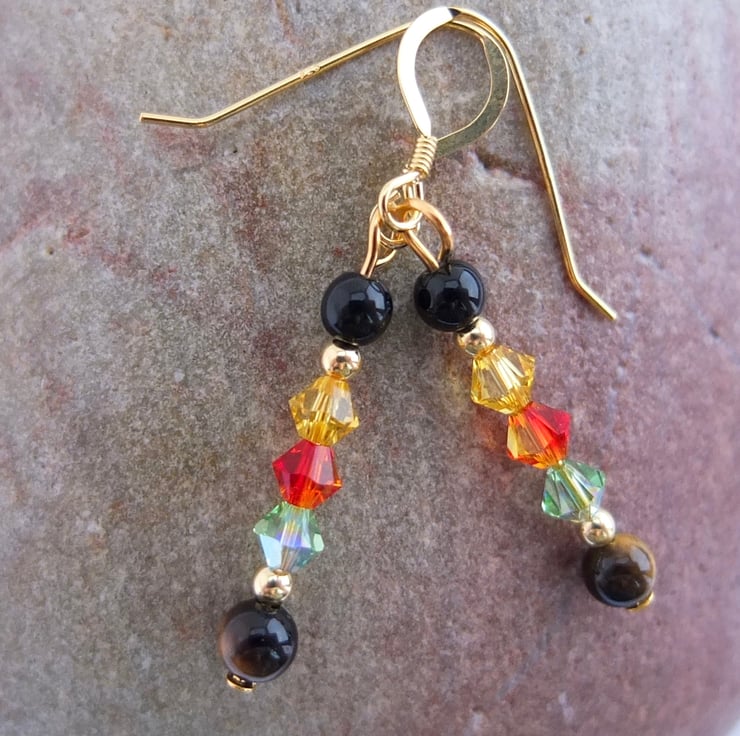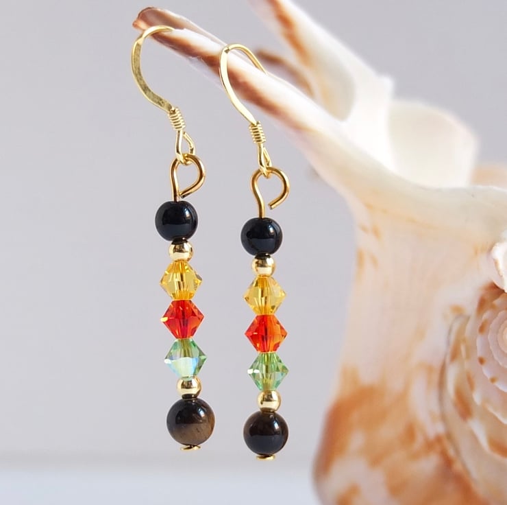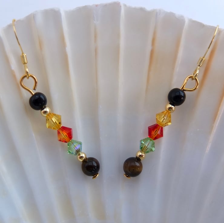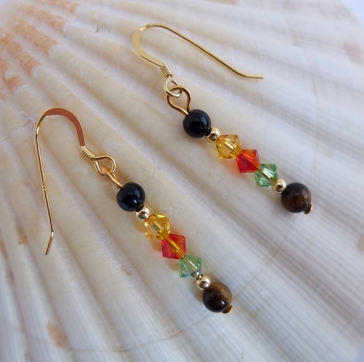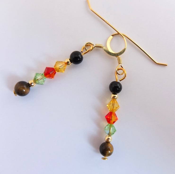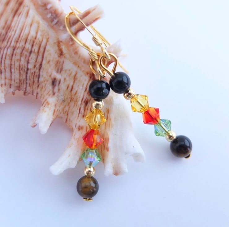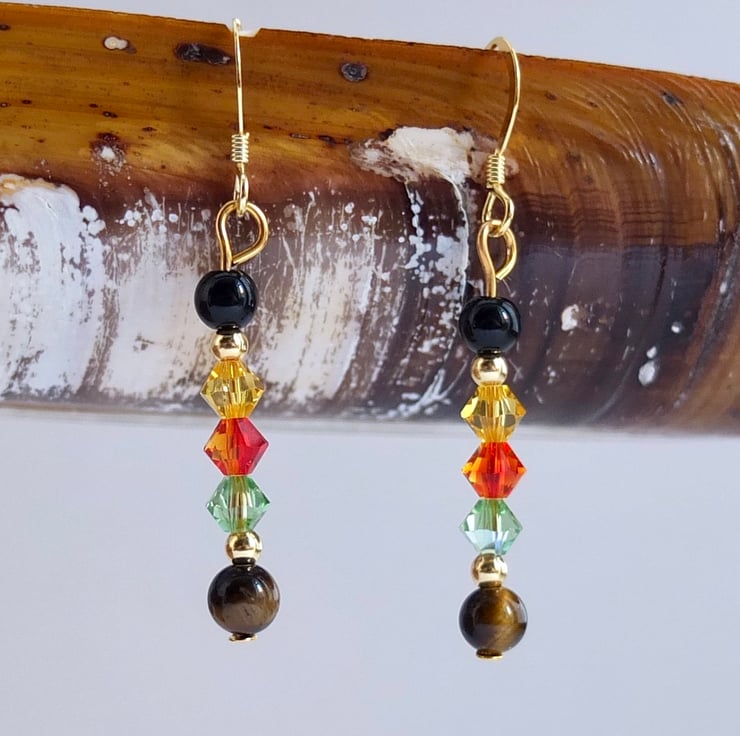 From top to bottom we have a round onyx bead, Swarovski bicones in the colours "light topaz", "fire opal" and "peridot", and a round Tiger's-eye bead.