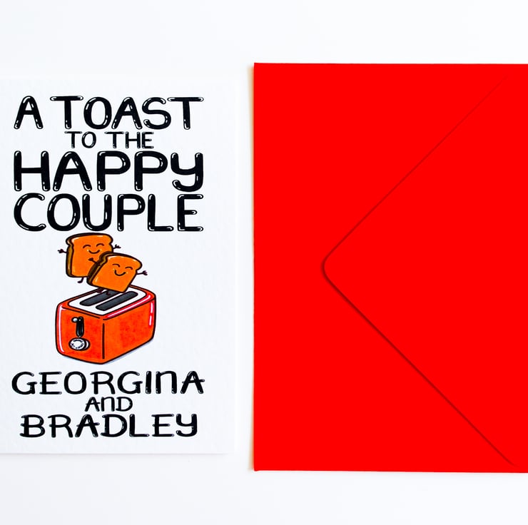 Greeting on front: A TOAST TO THE HAPPY COUPLE (then personalised names or greeting under Toaster image)