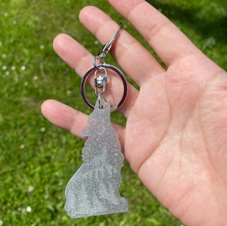 The silver grey glitter resin wolf is approximately 7 cm in size. Supplied with a large split ring to attach you keys to and a large lobster claw clasp to attach to your belt loop or bag.