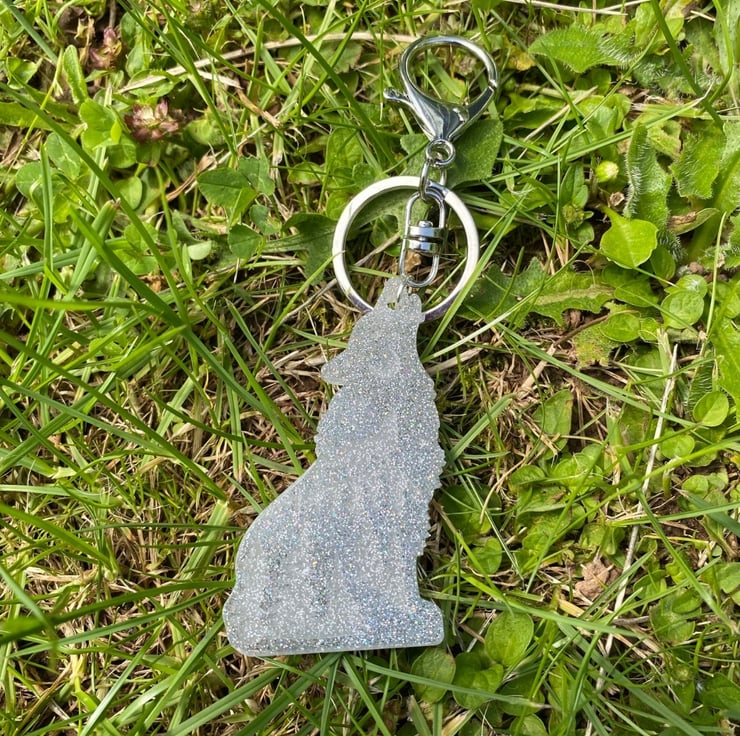 Silver grey wolf sparkly resin keyring with a large lobster claw style clasp and split ring to attach to your keys. Made to order, your wolf keyring will be sent to you 7 -10 working days after you have placed your order.