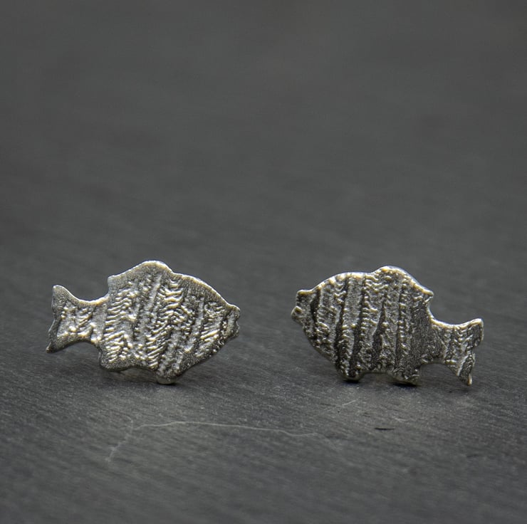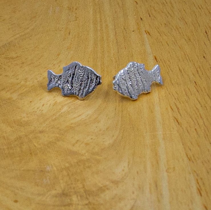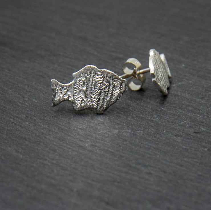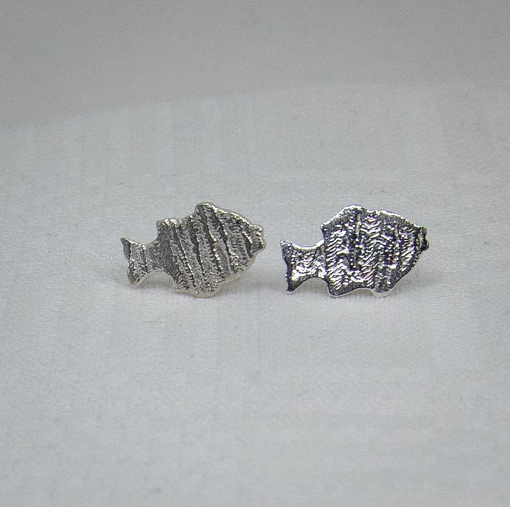 These fish stud earrings have a ripple effect pattern on them. They are made using silver clay and have stirling silver ear posts.