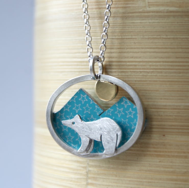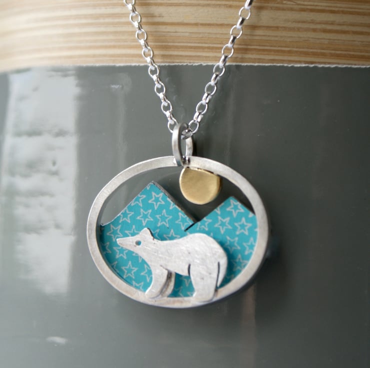 A cute necklace featuring a little silver bear and a starry sky with a little brass moon. This necklace is made from anodised aluminium, sterling silver, and brass and each piece has been carefully cut with a piercing saw and constructed in layers. The coloured aluminium pieces are patterned with a resist and immersion dyed. Hung from an 18 inch sterling silver chain. (Other lengths available, please ask).