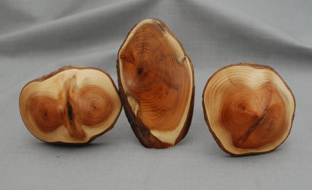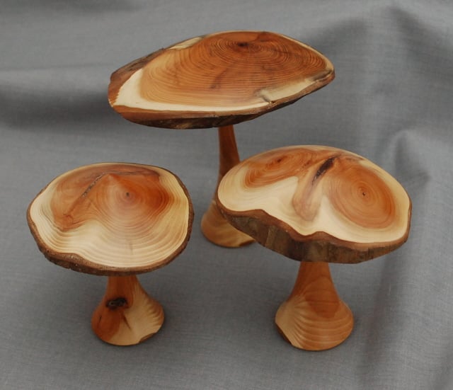 A handsome trio of bark edged fungi, hand turned from home-grown English yew. The tops of each one show the entire range of colours and textures hidden within the branches of yew trees. They range in size from 7.5 cm across to 10cm, and vary in height from 8cm to 10.5cm approximately.