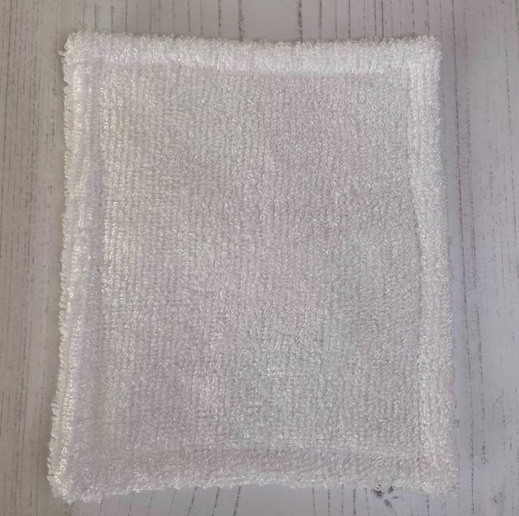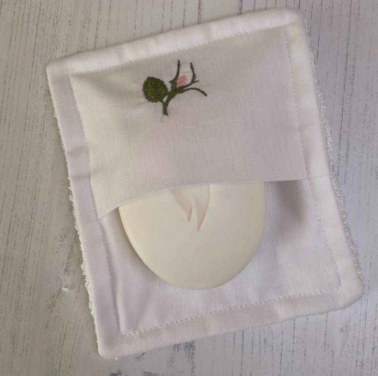 Back overlaps to keep your soap secure, to keep your soap safe. Front Bamboo Terry Towelling. Just soak the mitt and the soap will lather up. Wash in a cool wash, light iron on the cotton side and ready to go again. A handy cord for hanging.