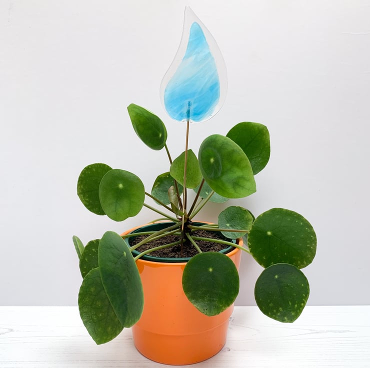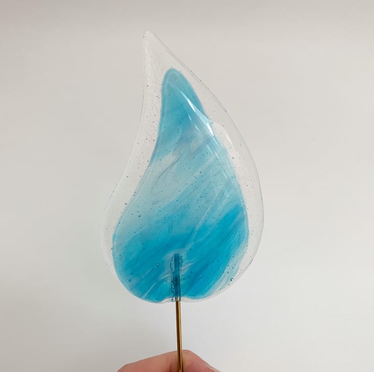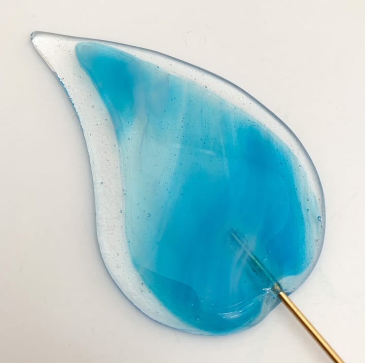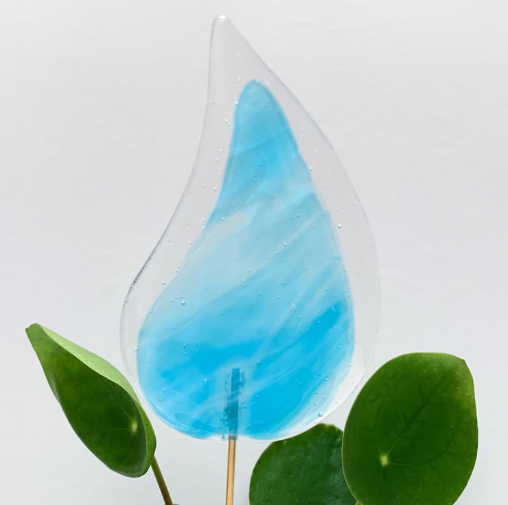 Fused glass plant stake in transparent and turquoise streaky glass. These stakes look lovely in a houseplant, especially when placed on a windowsill.