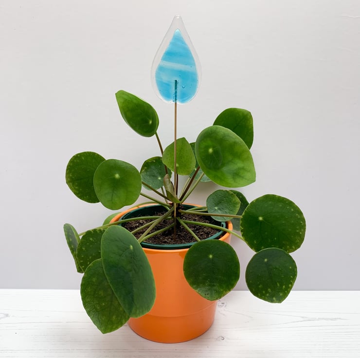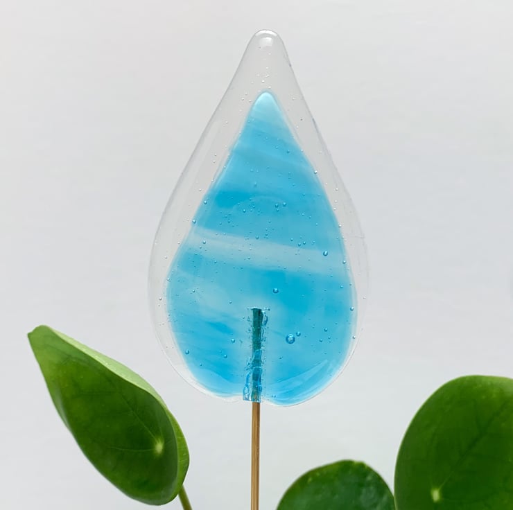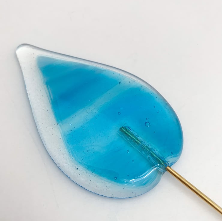 Fused glass plant stake in transparent and turquoise streaky glass. These stakes look lovely in a houseplant, especially when placed on a windowsill.