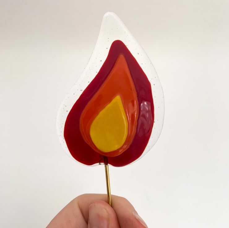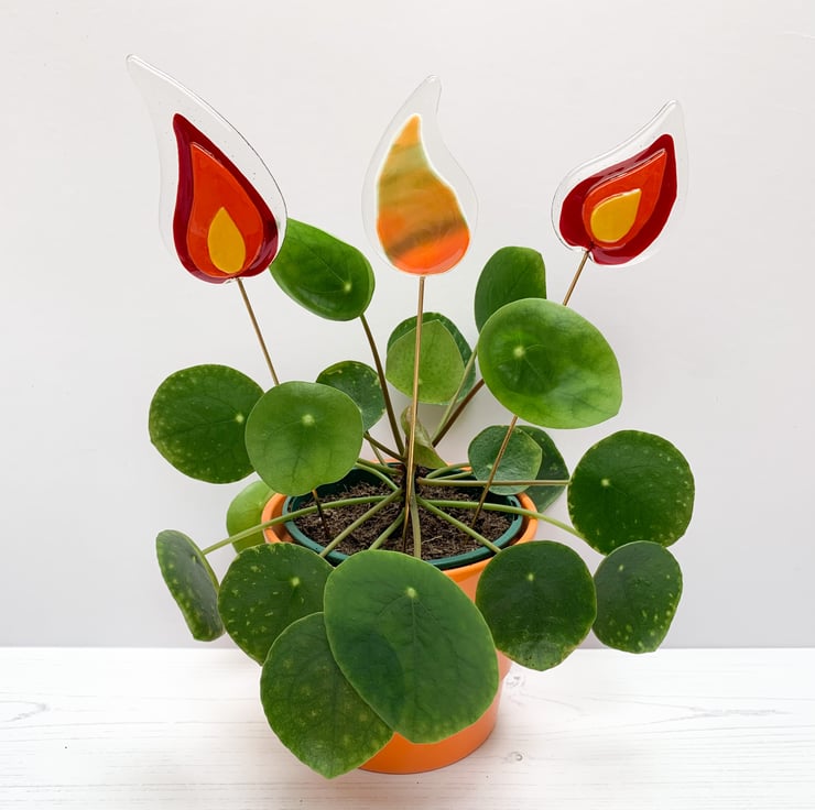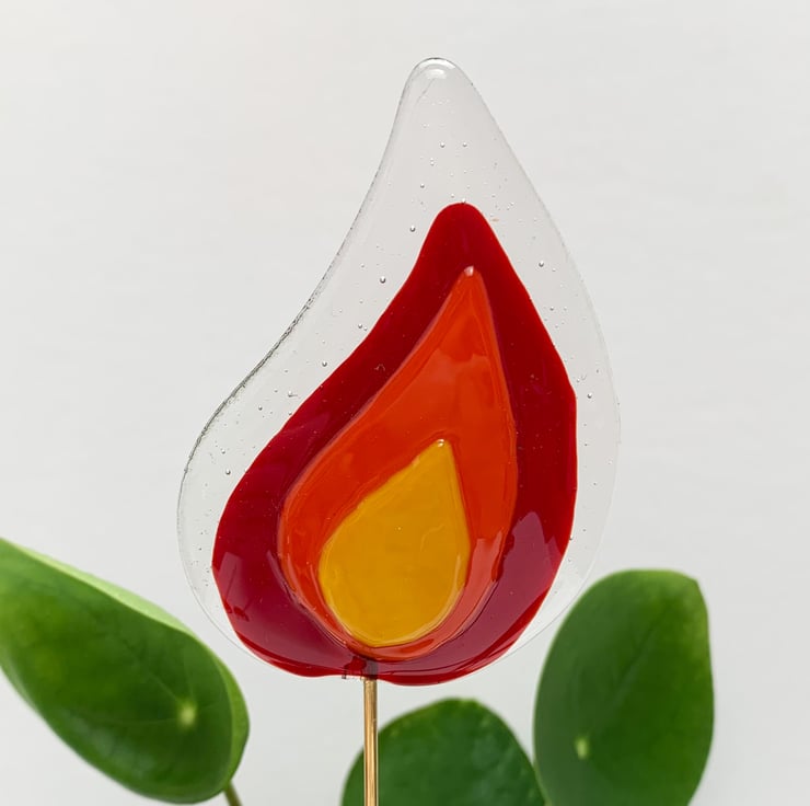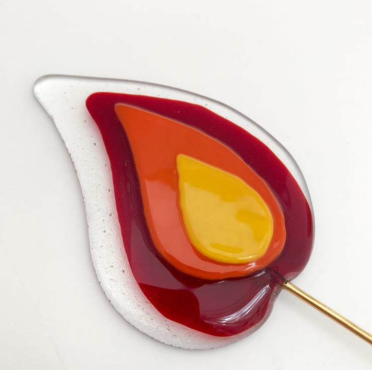 Fused glass plant stake in transparent and deep red, orange and yellow glass. These stakes look lovely in a houseplant, especially when placed on a windowsill.