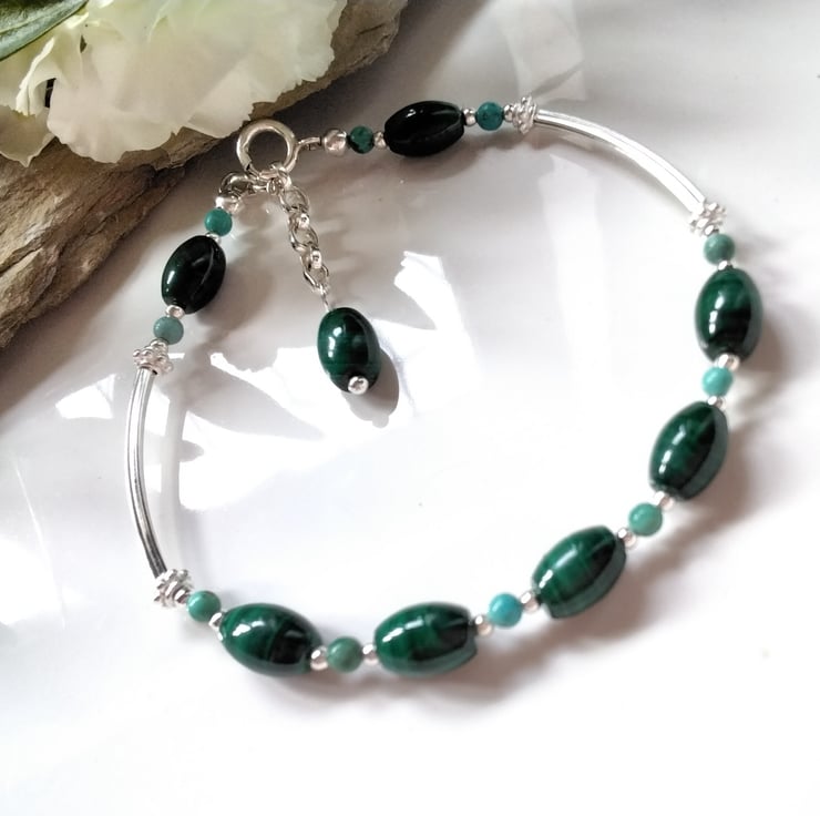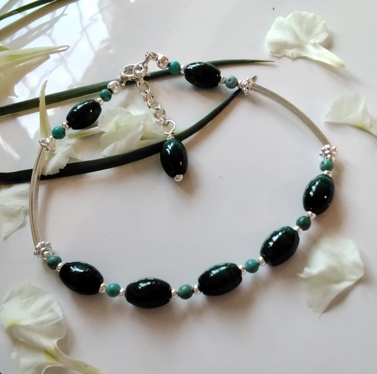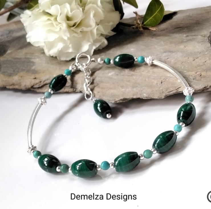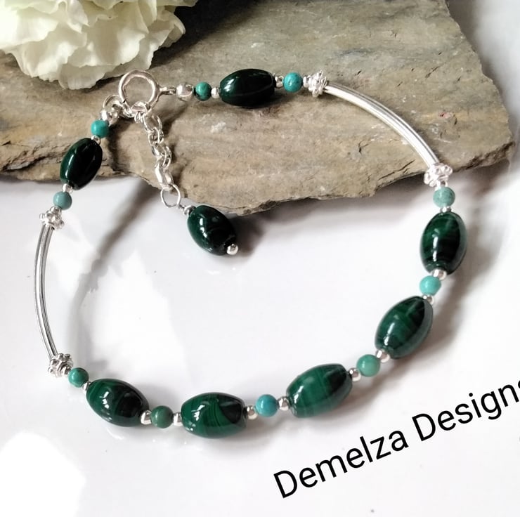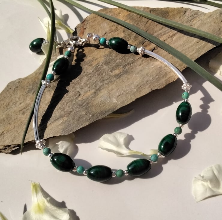 The item has been designed and hand crafted using 24.83cts malachite elongated drums complimented with 1.65cts of 3mm turquoise rounds. Between the gemstones are 2mm sterling silver spacer beads and two square shaped sterling silver tubes. For the main construction professional coated stainless steel jewellers wire has been used for added strength and lasting durability finished off with a heavy weight extender chain and 7mm bolt ring clasp.