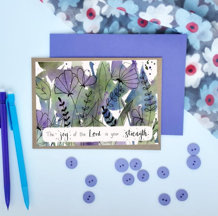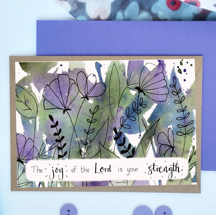 This card can be used for any occasion, so a very handy one to have ready for any occasion that pops up! Printed onto photo quality card, this image is taken from a hand painted original, featuring calm blues, purples and greens, with some airy pen drawn florals over the top.