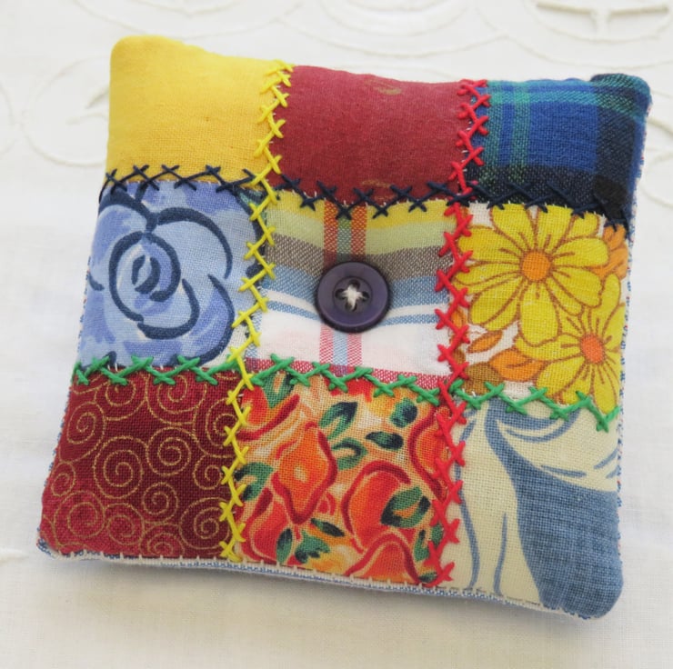 A bright selection of fabric squares, some of them off-cuts others reclaimed fabric, have been patchworked together, and embroidered, to create the front of this pincushion. The back is a blue and white striped canvas-type fabric.