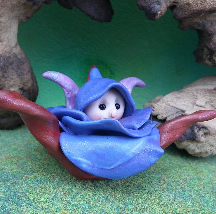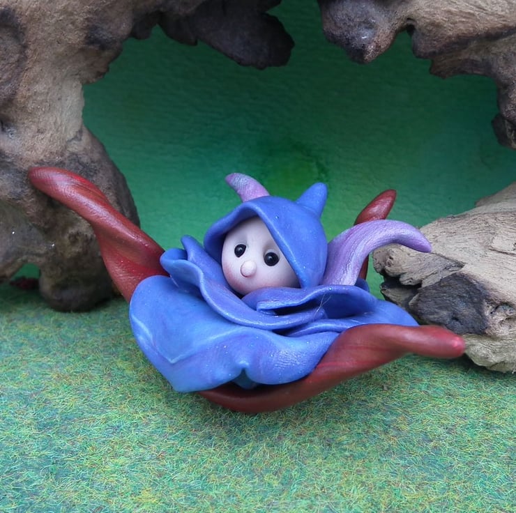 This is a 'one of a kind' creation having been entirely handmade without the use of moulds here at my studio on the Sussex Coast. Modelled with Prosculpt polymers, painted with heat set paints before sealing with lacquer, Libby has sparkling black onyx eyes. Libby the Blossom Gnome is just one and a half inches tall.