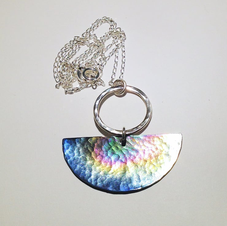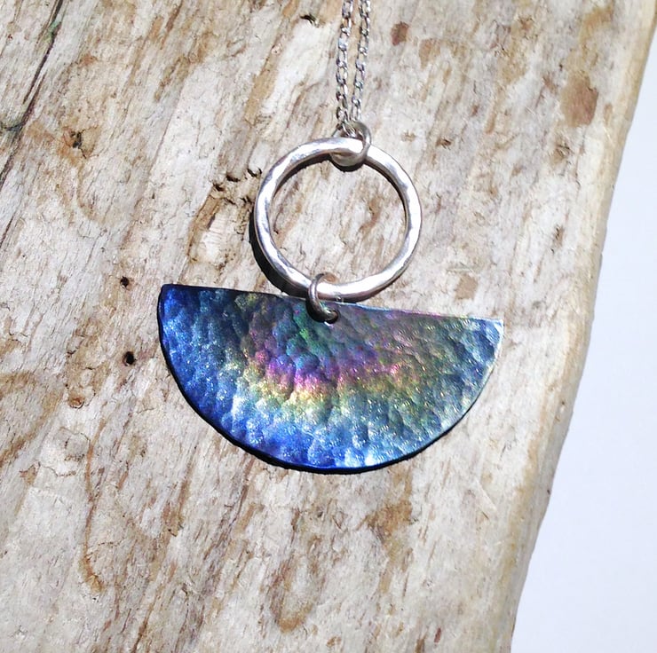 I have made a 1.8 cm sterling silver hoop and have given it a hammer textured finish. I have hand sawed a 3.5 cm wide semi-circular shape from titanium sheet and given it a hammer textured finish to create subtle shaping before colouring. I have attached this to the hoop with a sterling silver jump ring. The pendant measures approximately 3.6 cm long and is hung from an 18 inch sterling silver chain.