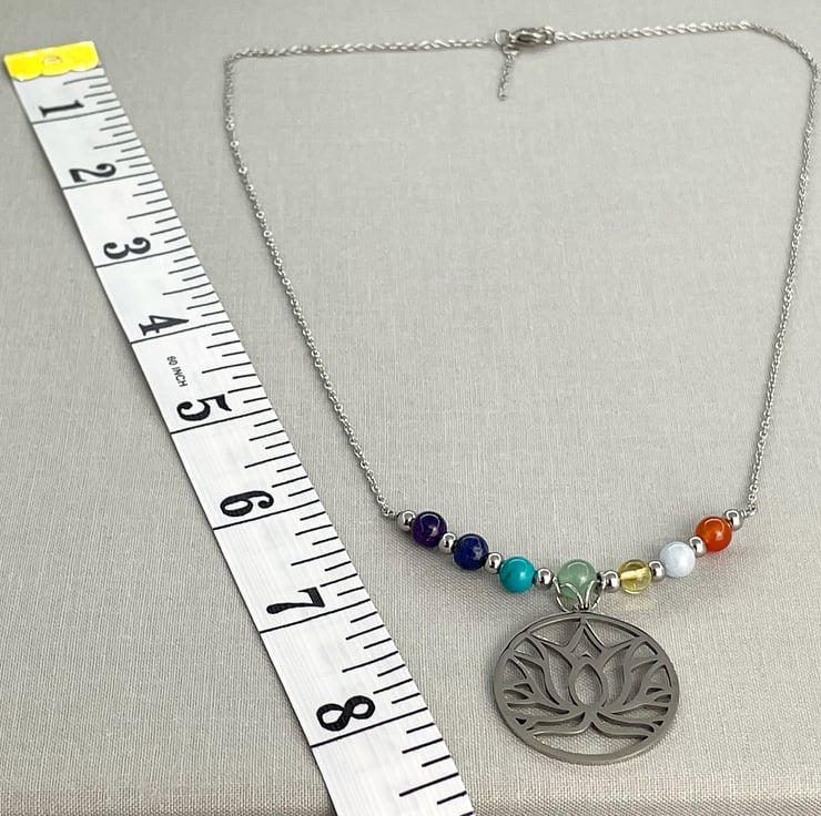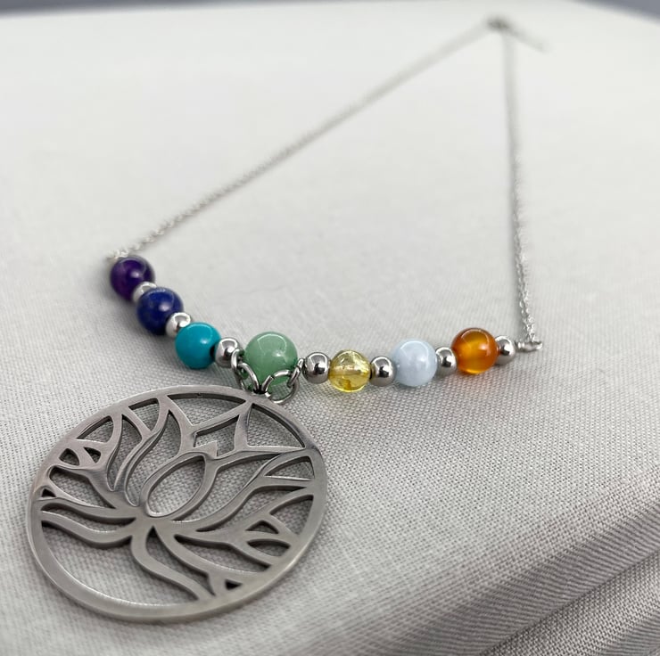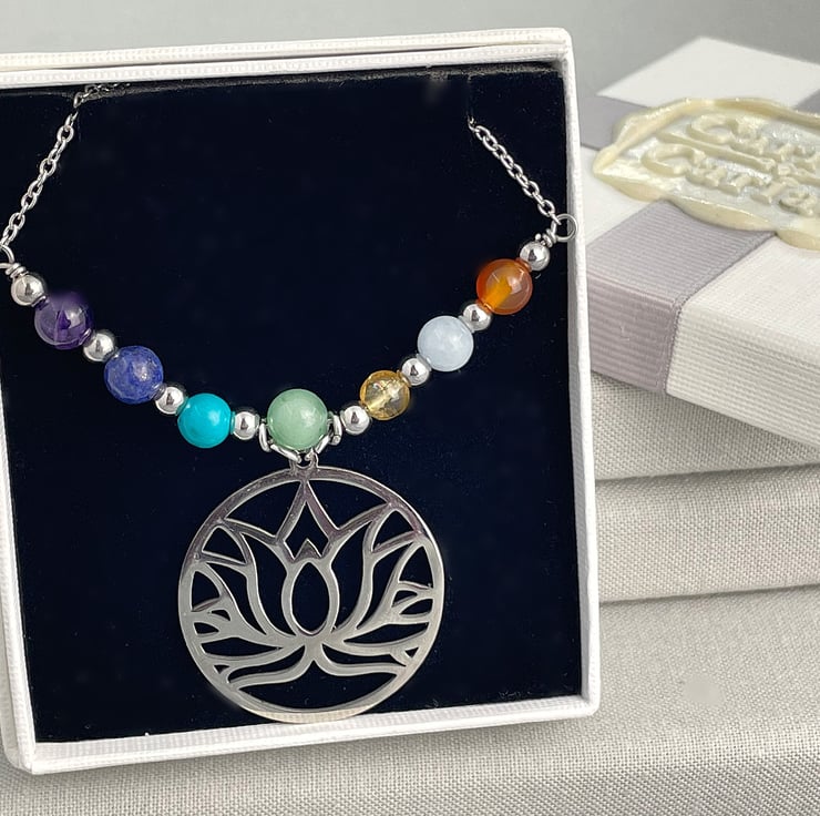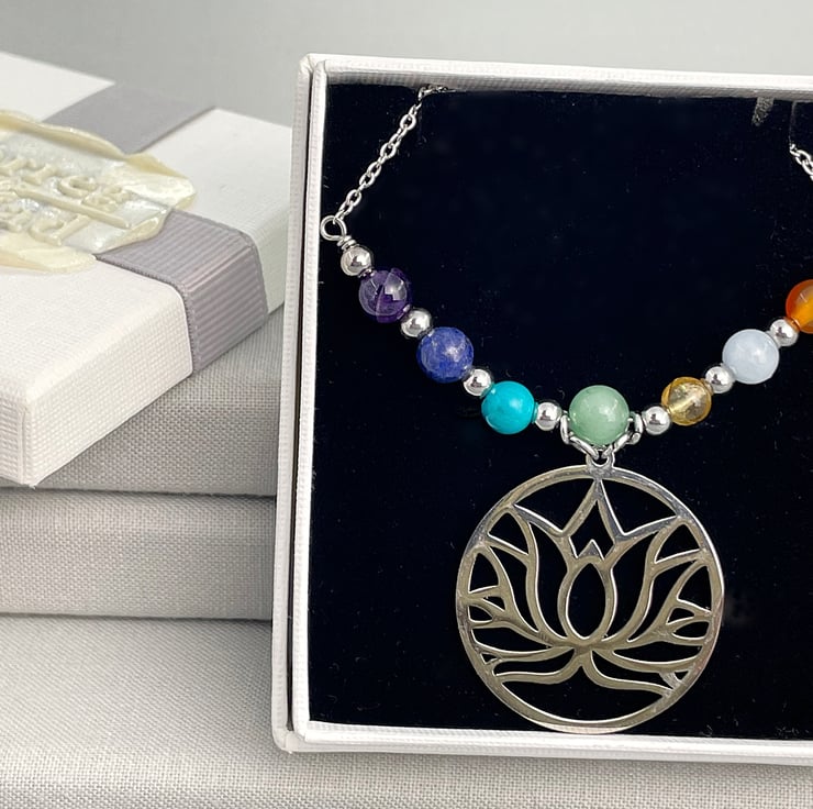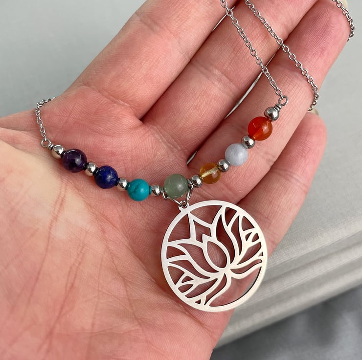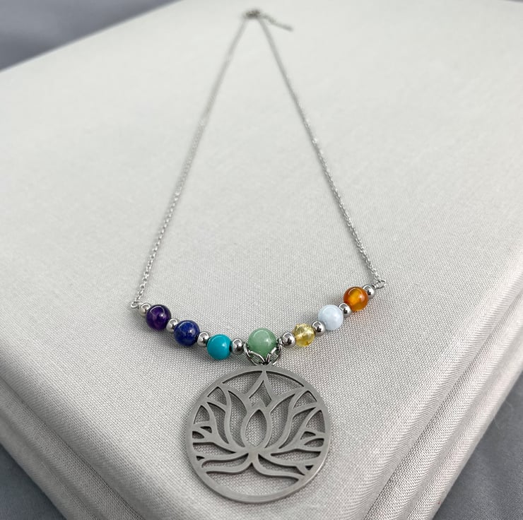 A stainless steel necklace featuring a lotus charm and the 7 gemstones pertaining to the chakra in the crystal healing world.