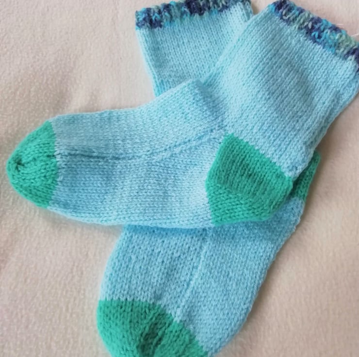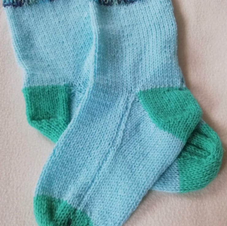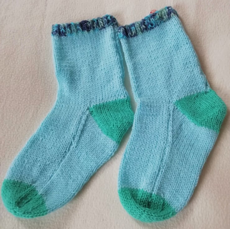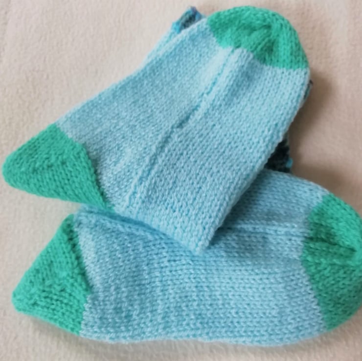 I have handknitted these socks in a mix of yarns from my stash. With soft hues of blue of the Sea with Jade green toes and heels. These socks are knitted in acrylic wool yarns making them a hardwearing affordable handcrafted item.