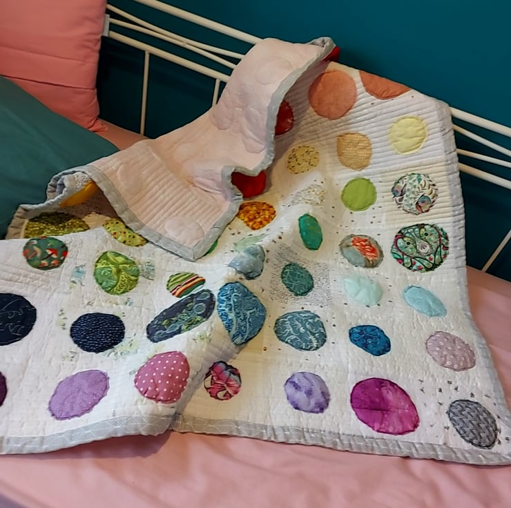 this quilt is made from 63 , 5 inch squares with a circle appliqued on these are then arranged in a rainbow from red on the top left corner to purples on the bottom right side , i have bound this quilt in grey as to not distract from any of the colours in it and the backing is a white and pale pink brocade design with a label made out of the one leftover block i had a yellow dear head by tula pink