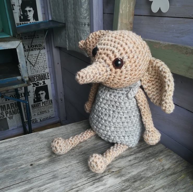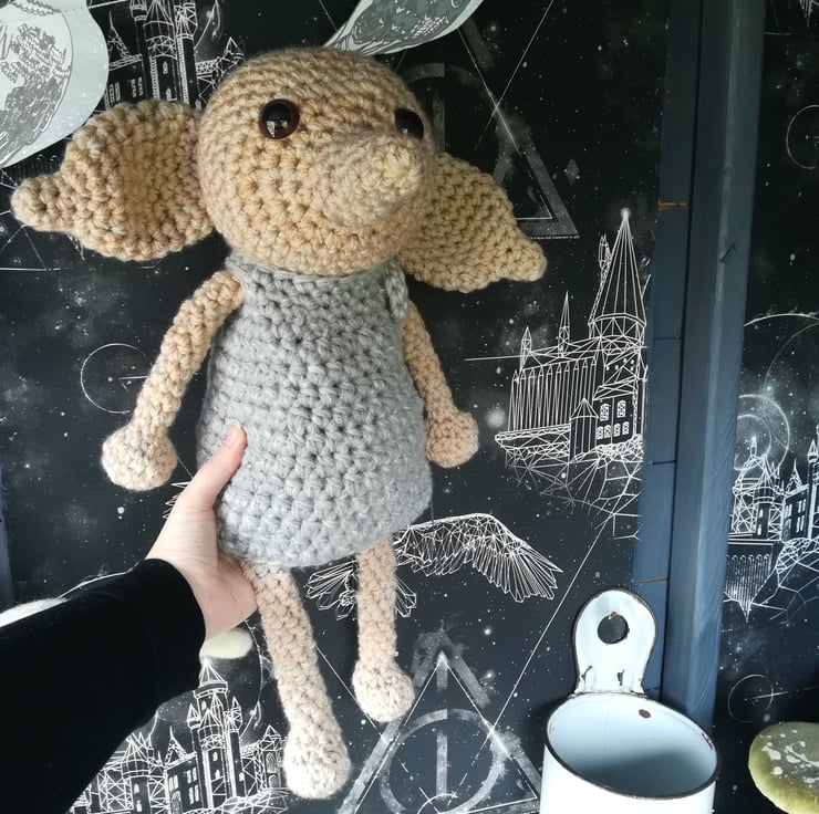 This extra special Dobby is made holding four strands of yarn together to make him a lovely big size. From head to feet he's 19 inches and about 14 inches across from ear to ear.