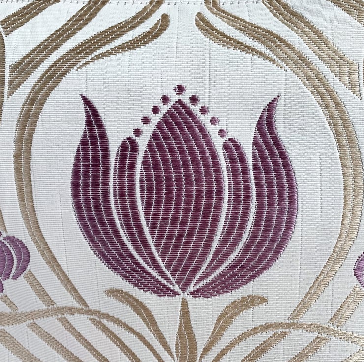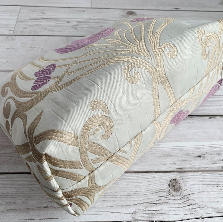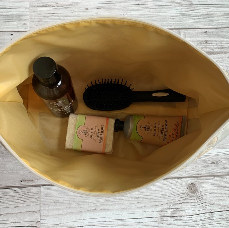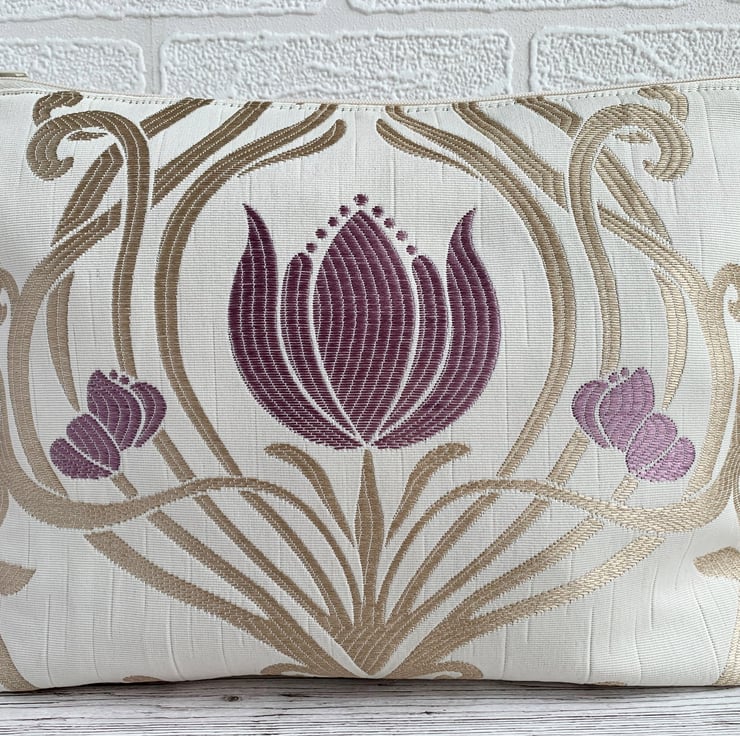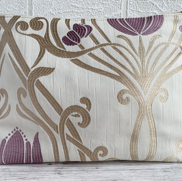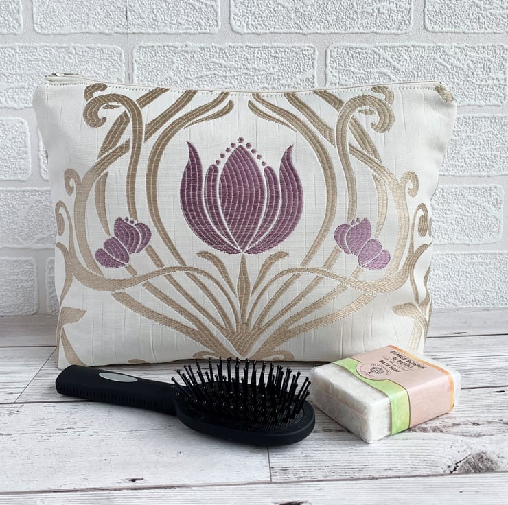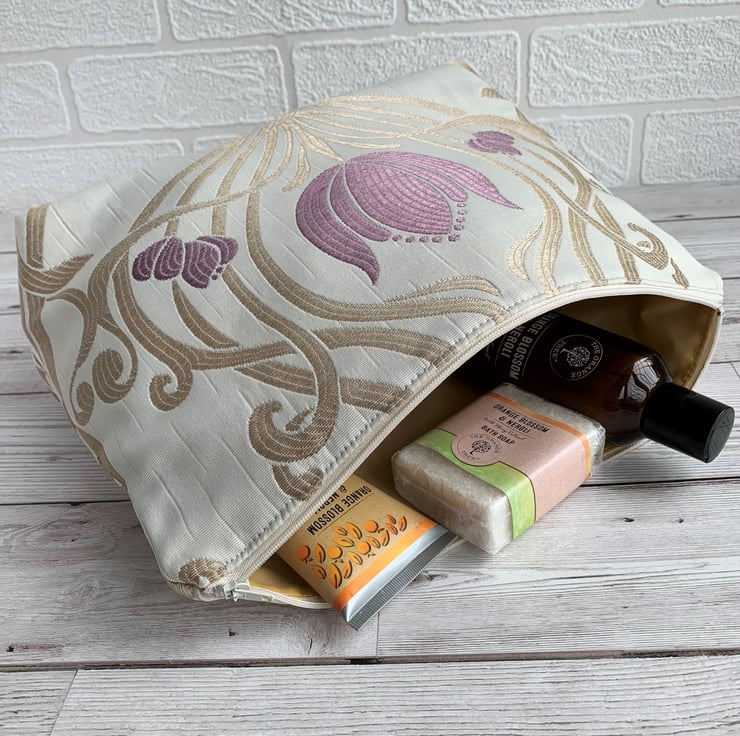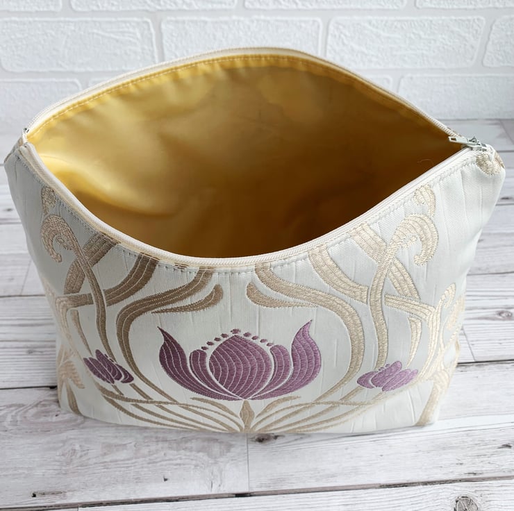 Art Nouveau style toiletry bag in Lalique amethyst fabric. This handy toiletry bag is made from lovely damask fabric in a design named Lalique, and a colourway named amethyst. The fabric is cream with a woven Art Nouveau style pattern featuring a symmetrical swirled lattice in light gold, interspersed with lilac stylised flowers. The flowers have a shape reminiscent of tulips. The bag fastens with a cream zip and the inside is fully lined with a golden yellow water-resistant lining. The base of the bag is boxed giving a plenty of room inside.