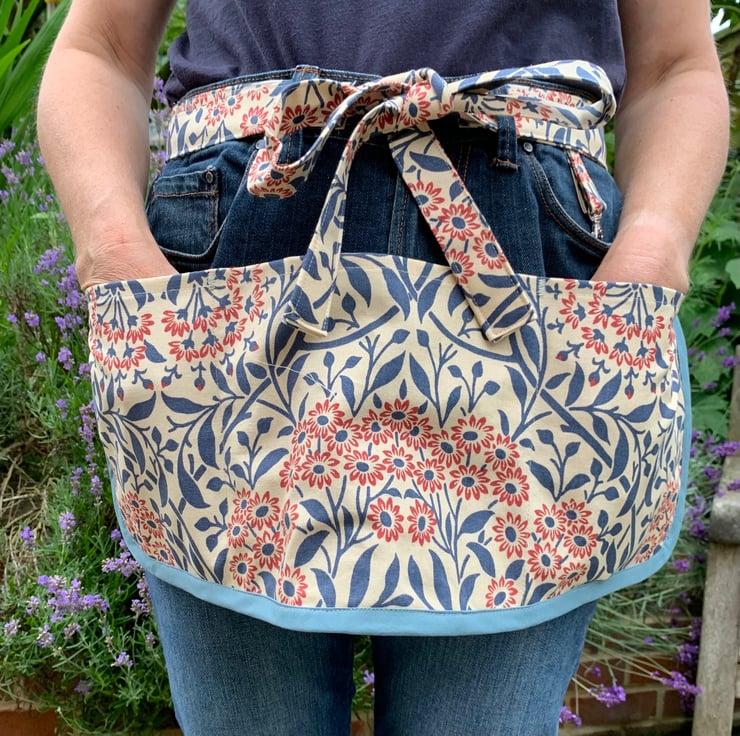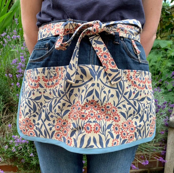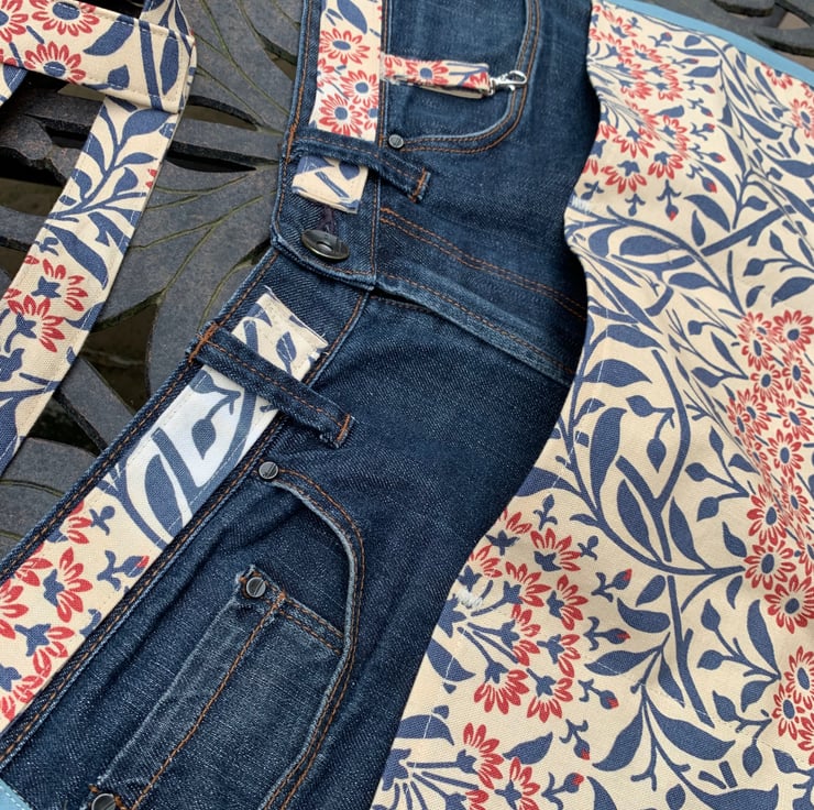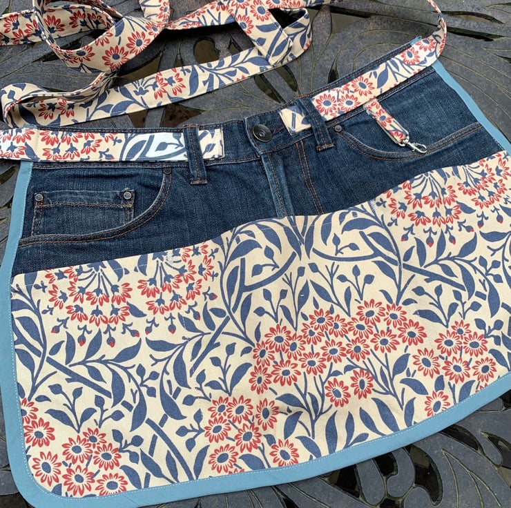 One of a kind apron or gardening tool belt made from reclaimed fabrics. The top of a pair of jeans forms the base and reclaimed William Morris Michaelmas Daisy cotton makes the pockets and ties. The apron is edged with cotton binding.