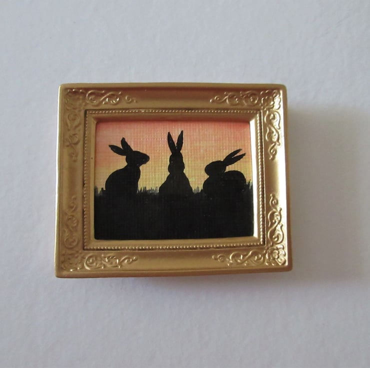 Doll House Miniature Original Painting Framed with Bunny Silhouette Rabbit