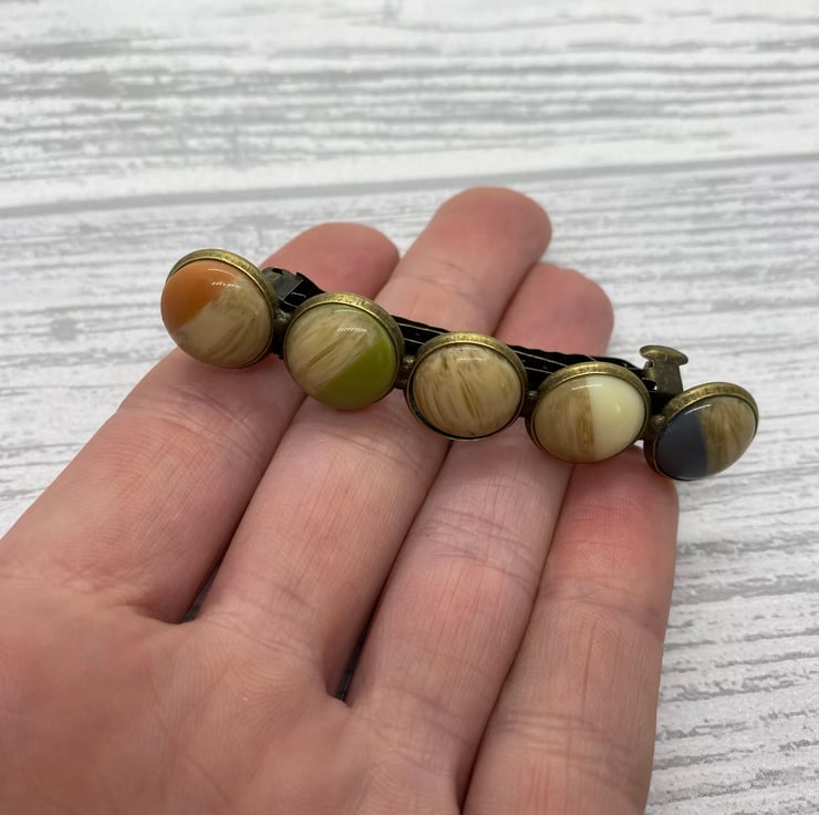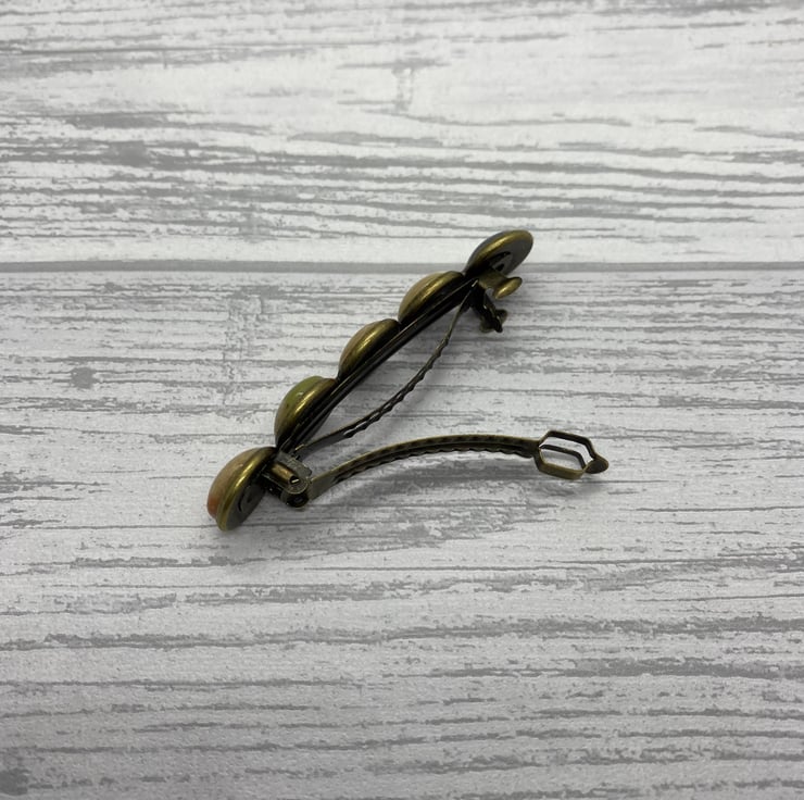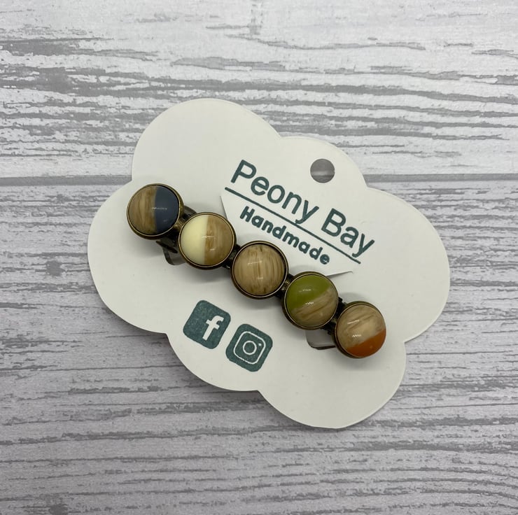 This barrette has five wood effect cabochons set on an antique bronze tone clip. The central cabochon is completely brown while the other four have a coloured edge. I’ve placed the cabochons to give the effect of ‘wood’ stripe on one side and a ‘coloured’ stripe on the other side.