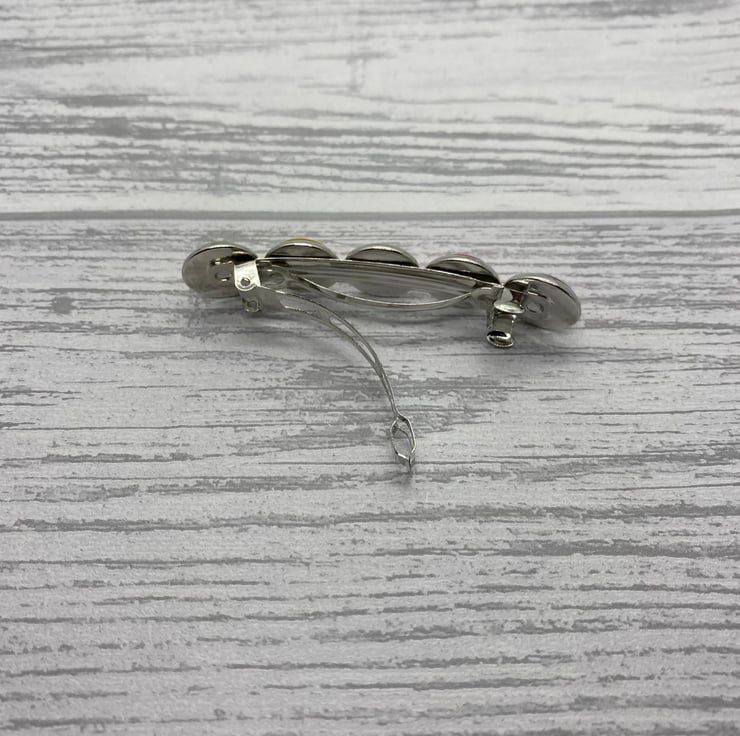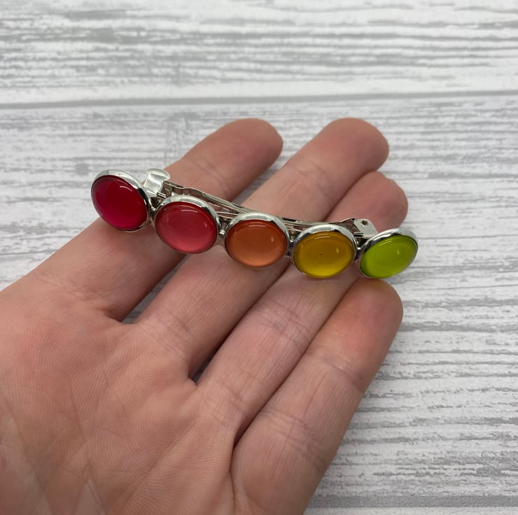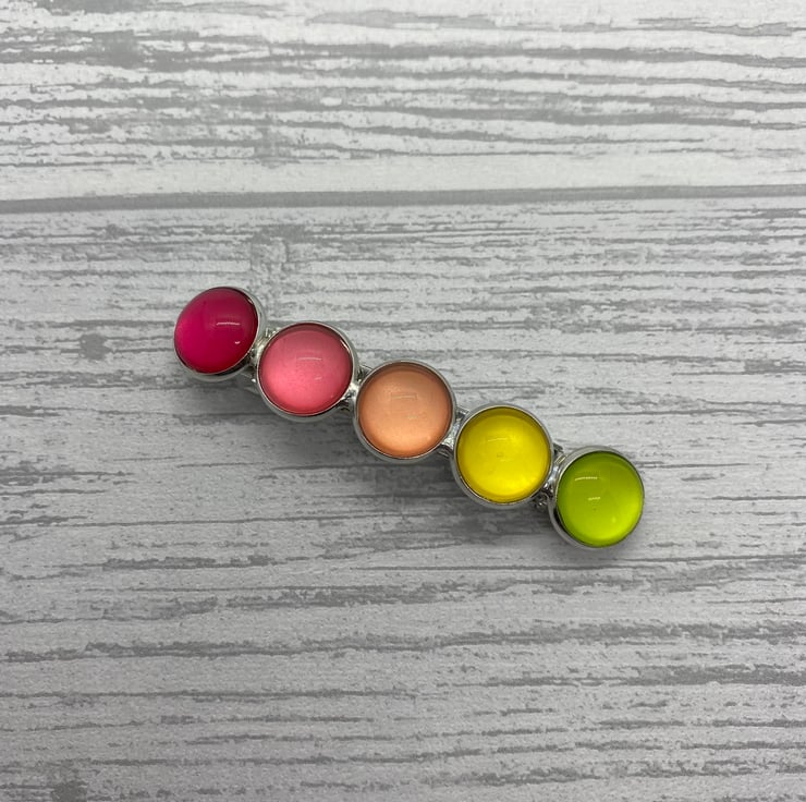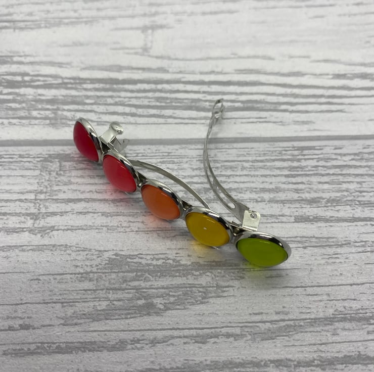 This barrette has five glass cabochons set on a silver tone clip. The cabochons range from pinks, to peach, to yellow, then green. The colours are lovely and fresh.